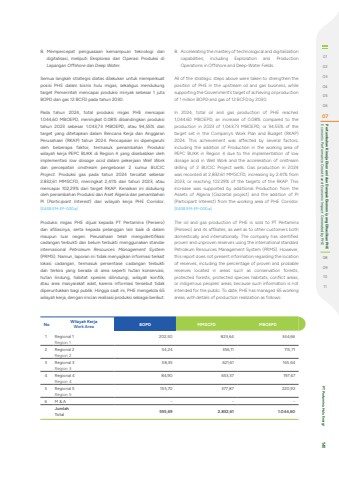 8. Mempercepat penguasaan kemampuan teknologi dan digitalisasi, meliputi Eksplorasi dan Operasi Produksi di Lapangan Offshore dan Deep Water. Semua langkah strategis diatas dilakukan untuk memperkuat posisi PHE dalam bisnis hulu migas, sekaligus mendukung target Pemerintah mencapai produksi minyak sebesar 1 juta BOPD dan gas 12 BCFD pada tahun 2030.Pada tahun 2024, total produksi migas PHE mencapai 1.044,60 MBOEPD, meningkat 0.08% dibandingkan produksi tahun 2023 sebesar 1.043,73 MBOEPD, atau 94,55% dari target yang ditetapkan dalam Rencana Kerja dan Anggaran Perusahaan (RKAP) tahun 2024. Pencapaian ini dipengaruhi oleh beberapa faktor, termasuk penambahan Produksi wilayah kerja PEPC BUKK di Region 4 yang disebabkan oleh implementasi low dosage acid dalam pekerjaan Well Workdan percepatan onstream pengeboran 2 sumur BUCIC Project. Produksi gas pada tahun 2024 tercatat sebesar 2.832,61 MMSCFD, meningkat 2,41% dari tahun 2023, atau mencapai 102,29% dari target RKAP. Kenaikan ini didukung oleh penambahan Produksi dari Aset Algeria dan penambahan PI (Participant Interest) dari wilayah kerja PHE Corridor. [SASB EM-EP-000.a]Produksi migas PHE dijual kepada PT Pertamina (Persero) dan afiliasinya, serta kepada pelanggan lain baik di dalam maupun luar negeri. Perusahaan telah mengidentifikasi cadangan terbukti dan belum terbukti menggunakan standar internasional Petroleum Resources Management System(PRMS). Namun, laporan ini tidak menyajikan informasi terkait lokasi cadangan, termasuk persentase cadangan terbukti dan terkira yang berada di area seperti hutan konservasi, hutan lindung, habitat spesies dilindungi, wilayah konflik, atau area masyarakat adat, karena informasi tersebut tidak diperuntukkan bagi publik. Hingga saat ini, PHE mengelola 65 wilayah kerja, dengan rincian realisasi produksi sebagai berikut: 8. Accelerating the mastery of technological and digitalization capabilities, including Exploration and Production Operations in Offshore and Deep-Water Fields.All of the strategic steps above were taken to strengthen the position of PHE in the upstream oil and gas business, while supporting the Government's target of achieving oil production of 1 million BOPD and gas of 12 BCFD by 2030.In 2024, total oil and gas production of PHE reached 1,044.60 MBOEPD, an increase of 0.08% compared to the production in 2023 of 1,043.73 MBOEPD, or 94.55% of the target set in the Company%u2019s Work Plan and Budget (RKAP) 2024. This achievement was affected by several factors, including the addition of Production in the working area of PEPC BUKK in Region 4 due to the implementation of low dosage acid in Well Work and the acceleration of onstream drilling of 2 BUCIC Project wells. Gas production in 2024 was recorded at 2,832.61 MMSCFD, increasing by 2.41% from 2023, or reaching 102.29% of the targets of the RKAP. This increase was supported by additional Production from the Assets of Algeria (Gazzetal project) and the addition of PI (Participant Interest) from the working area of PHE Corridor. [SASB EM-EP-000.a]The oil and gas production of PHE is sold to PT Pertamina (Persero) and its affiliates, as well as to other customers both domestically and internationally. The company has identified proven and unproven reserves using the international standard Petroleum Resources Management System (PRMS). However, this report does not present information regarding the location of reserves, including the percentage of proven and probable reserves located in areas such as conservation forests, protected forests, protected species habitats, conflict areas, or indigenous peoples' areas, because such information is not intended for the public. To date, PHE has managed 65 working areas, with details of production realization as follows: 01020304050607 Economic Performance Growth and Economic Impact Generated by PHE Pertumbuhan Kinerja Ekonomi dan Dampak Ekonomi yang Dihasilkan PHE08091011 PT Pertamina Hulu Energi 141No Wilayah KerjaWork Area BOPD MMSCFD MBOEPD1 Regional 1Region 1202,50 823,64 344,662 Regional 2Region 254,24 356,11 115,713 Regional 3Region 358,35 621,61 165,644 Regional 4Region 484,90 653,37 197,675 Regional 5Region 5155,70 377,87 220,926 M & A - - -JumlahTotal 555,69 2.832,61 1.044,60