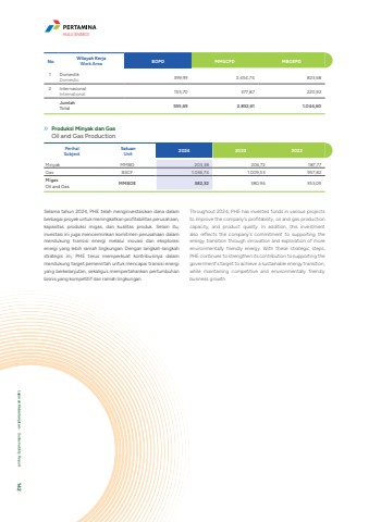 HULU ENERGILaporan Keberlanjutan %u2022 Sustainability Report 142Selama tahun 2024, PHE telah menginvestasikan dana dalam berbagai proyek untuk meningkatkan profitabilitas perusahaan, kapasitas produksi migas, dan kualitas produk. Selain itu, investasi ini juga mencerminkan komitmen perusahaan dalam mendukung transisi energi melalui inovasi dan eksplorasi energi yang lebih ramah lingkungan. Dengan langkah-langkah strategis ini, PHE terus memperkuat kontribusinya dalam mendukung target pemerintah untuk mencapai transisi energi yang berkelanjutan, sekaligus mempertahankan pertumbuhan bisnis yang kompetitif dan ramah lingkungan. Throughout 2024, PHE has invested funds in various projects to improve the company's profitability, oil and gas production capacity, and product quality. In addition, this investment also reflects the company's commitment to supporting the energy transition through innovation and exploration of more environmentally friendly energy. With these strategic steps, PHE continues to strengthen its contribution to supporting the government's target to achieve a sustainable energy transition, while maintaining competitive and environmentally friendly business growth. No Wilayah KerjaWork Area BOPD MMSCFD MBOEPD1 DomestikDomestic 399,99 2.454,74 823,682 InternasionalInternational 155,70 377,87 220,92JumlahTotal 555,69 2.832,61 1.044,60PerihalSubjectSatuanUnit 2024 2023 2022Minyak MMBO 203,38 206,72 187,77 Gas BSCF 1.036,74 1.009,53 957,82 MigasOil and Gas MMBOE 382,32 380,96 353,09 Produksi Minyak dan GasOil and Gas Production