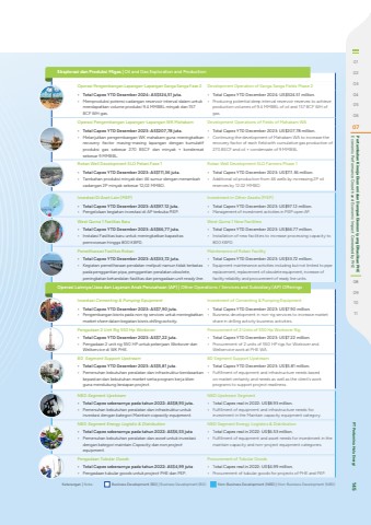 01020304050607 Economic Performance Growth and Economic Impact Generated by PHE Pertumbuhan Kinerja Ekonomi dan Dampak Ekonomi yang Dihasilkan PHE08091011 PT Pertamina Hulu Energi 145Operasi Pengembangan Lapangan-Lapangan Sanga Sanga Fase 2 Development Operation of Sanga Sanga Fields Phase 2%u2022 Total Capex YTD Desember 2024: AS$324,51 juta.%u2022 Memproduksi potensi cadangan reservoir interval dalam untuk mendapatkan volume produksi 9.4 MMBBL minyak dan 157 BCF WH gas.%u2022 Total Capex YTD December 2024: US$324.51 million.%u2022 Producing potential deep interval reservoir reserves to achieve production volumes of 9.4 MMBBL of oil and 157 BCF WH of gas.Operasi Pengembangan Lapangan-Lapangan WK Mahakam Development Operations of Fields of Mahakam WA %u2022 Total Capex YTD Desember 2023: AS$207,78 juta.%u2022 Melanjutkan pengembangan WK mahakam guna meningkatkan recovery factor masing-masing lapangan dengan kumulatif produksi gas sebesar 270 BSCF dan minyak + kondensat sebesar 9 MMBBL.%u2022 Total Capex YTD December 2023: US$207.78 million.%u2022 Continuing the development of Mahakam WA to increase the recovery factor of each field with cumulative gas production of 270 BSCF and oil + condensate of 9 MMBBL.Rokan Well Development SLO Petani Fase 1 Rokan Well Development SLO Farmers Phase 1%u2022 Total Capex YTD Desember 2023: AS$111,36 juta.%u2022 Tambahan produksi minyak dari 46 sumur dengan menambah cadangan 2P minyak sebesar 12,02 MMBO.%u2022 Total Capex YTD December 2023: US$111.36 million.%u2022 Additional oil production from 46 wells by increasing 2P oil reserves by 12.02 MMBO.Investasi Di Aset Lain (PIEP) Investment in Other Assets (PIEP)%u2022 Total Capex YTD Desember 2023: AS$97.12 juta.%u2022 Pengelolaan kegiatan investasi di AP terbuka PIEP.%u2022 Total Capex YTD December 2023: US$97.12 million.%u2022 Management of investment activities in PIEP open AP.West Qurna 1 Fasilitas Baru West Qurna 1 New Facilities%u2022 Total Capex YTD Desember 2023: AS$66,77 juta.%u2022 Instalasi Fasilitas baru untuk meningkatkan kapasitas pemrosesan hingga 800 KBPD.%u2022 Total Capex YTD December 2023: US$66.77 million.%u2022 Installation of new facilities to increase processing capacity to 800 KBPD.Pemeliharaan Fasilitas Rokan Maintenance of Rokan Facility %u2022 Total Capex YTD Desember 2023: AS$33,72 juta.%u2022 Kegiatan pemeliharaan peralatan meliputi namun tidak terbatas pada penggantian pipa, penggantian peralatan obsolete, peningkatan kehandalan fasilitas dan pengadaan unit ready line.%u2022 Total Capex YTD December 2023: US$33.72 million.%u2022 Equipment maintenance activities including but not limited to pipe replacement, replacement of obsolete equipment, increase of facility reliability and procurement of ready line units.Investasi Cementing & Pumping Equipment Investment of Cementing & Pumping Equipment %u2022 Total Capex YTD Desember 2023: AS$7,90 juta.%u2022 Pengembangan bisnis pada non rig services untuk meningkatkan market share dalam kegiatan bisnis drilling activity.%u2022 Total Capex YTD December 2023: US$7.90 million. %u2022 Business development in non-rig services to increase market share in drilling activity business activities.Pengadaan 2 Unit Rig 550 Hp Workover Procurement of 2 Units of 550 Hp Workover Rig%u2022 Total Capex YTD Desember 2023: AS$7,22 juta.%u2022 Pengadaan 2 unit rig 550 HP untuk pekerjaan Workover dan Wellservice di WK PHE.%u2022 Total Capex YTD December 2023: US$7.22 million. %u2022 Procurement of 2 units of 550 HP rigs for Workover and Wellservice work at PHE WA.BD Segment Support Upstream BD Segment Support Upstream%u2022 Total Capex YTD Desember 2023: AS$5,81 juta.%u2022 Pemenuhan kebutuhan peralatan dan infrastruktur berdasarkan kepastian dan kebutuhan market serta program kerja klien guna mendukung kesiapan project.%u2022 Total Capex YTD December 2023: US$5.81 million. %u2022 Fulfillment of equipment and infrastructure needs based on market certainty and needs as well as the client%u2019s work programs to support project readiness.NBD Segment Upstream NBD Upstream Segment%u2022 Total Capex sebenarnya pada tahun 2022: AS$8,93 juta.%u2022 Pemenuhan kebutuhan peralatan dan infrastruktur untuk investasi dengan kategori Maintain capacity equipment.%u2022 Total Capex real in 2022: US$8.93 million.%u2022 Fulfillment of equipment and infrastructure needs for. investment in the Maintain capacity equipment category.NBD Segment Energy Logistic & Distribution NBD Segment Energy Logistics & Distribution%u2022 Total Capex sebenarnya pada tahun 2022: AS$6,53 juta%u2022 Pemenuhan kebutuhan peralatan dan asset untuk investasi dengan kategori maintain Capacity dan non project equipment.%u2022 Total Capex real in 2022: US$6.53 million.%u2022 Fulfillment of equipment and asset needs for investment in the maintain capacity and non-project equipment categories.Pengadaan Tubular Goods Procurement of Tubular Goods%u2022 Total Capex sebenarnya pada tahun 2022: AS$4,99 juta%u2022 Pengadaan tubular goods untuk project PHE dan PEP.%u2022 Total Capex real in 2022: US$4.99 million.%u2022 Procurement of tubular goods for projects of PHE and PEP.Keterangan | Note: Business Development (BD) | Business Development (BD) Non-Business Development (NBD) | Non-Business Development (NBD)Eksplorasi dan Produksi Migas | Oil and Gas Exploration and ProductionOperasi Lainnya/Jasa dan Layanan Anak Perusahaan (AP) | Other Operations / Services and Subsidiary (AP) Offerings