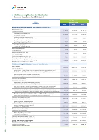 HULU ENERGILaporan Keberlanjutan %u2022 Sustainability Report 150Nilai Ekonomi yang Dihasilkan dan DidistribusikanEconomic Value Earned and DistributedUraianDescriptionNilai EkonomiEconomic Value 2024 2023 2022Nilai Ekonomi Langsung Dihasilkan | Directly Earned Economic ValuePendapatan UsahaOperating Revenues 14.330,34 14.568,38 16.183,40Pendapatan Minyak dan GasOil and Gas Revenue 13.725,39 13.974,86 15.583,86Jasa Distribusi dan Logistik EnergiEnergy Distribution and Logistics Services 419,77 434,65 483,71Pendapatan dari Jasa PengeboranRevenue from Drilling Services 136,65 107,19 85,19Jasa Penunjang MigasOil and Gas Support Services 48,53 51,68 30,64Penghasilan KeuanganFinancial Income 251,56 140,41 48,99Keuntungan selisih kurs, netoNet exchange gain (4,48) (19,77) 53,83(Beban)/pendapatan lain-lain, netoNet (expenses)/income from other sources 315,44 (112,75) (247,87)Jumlah Penerimaan Nilai Ekonomi LangsungTotal Directly Earned Economic Value 14.892,86 14.576,27 16.038,35Nilai Ekonomi Yang Didistribusikan | Economic Value DistributedBiaya OperasiOperating Expenses (7.926,25) (8.223,75) (7.183,14)Beban Pokok Penjualan (Diluar beban tenaga kerja/gaji /upah pekerja, beban CSR)Cost of Goods Sold (Excluding labor costs/salaries/wages, CSR expenses) (7.710,58) (7.516,66) (7.017,54)Penyisihan penurunan nilai aset non-keuanganProvision for impairment of non-financial assets (215,67) (707,09) (165,61)Distribusi kepada PekerjaDistribution to Employees (1.596,97) (1.386,26) (1.478,36)Biaya Pekerja (termasuk dalam Beban Produksi)Labor Costs (included in Production Expenses) (688,34) (522,23) (642,67)Gaji dan Tunjangan Pekerja (termasuk dalam Beban Umum dan Administrasi)Wages and Allowances (included in General and Administrative Expenses) (510,01) (481,96) (522,28)Jasa Konsultan dan Profesional (termasuk dalam Beban Umum dan Administrasi)Consultant and Professional Fees (included in General and Administrative Expenses) (143,63) (135,45) (110,93)Biaya tenaga kerja (termasuk dalam Beban dari Aktivitas Operasi Lainnya)Labor Expenses (included in Other Operating Activities Expenses) (254,99) (246,62) (202,48)Distribusi Kepada Penyedia Dana Distribution to Providers of Funds (2.533,66) (4.123,59) (3.132,01)Beban Keuangan (kepada Kreditor)Financial Expenses (to Creditors) (453,91) (459,29) (243,91)Dividen (kepada Pemegang Saham)Dividends (to Shareholders) (2.079,75) (3.664,30) (2.888,11)Distribusi kepada PemerintahDistribution to Government (1.771,54) (1.766,49) (2.444,09)Beban Pajak Penghasilan NetoNet Income Tax Expenses (1.771,54) (1.766,49) (2.444,09)Distribusi kepada masyarakat: Dana CSRDistribution to the community: CSR Funds (23,16) (14,94) (14,69)Jumlah Nilai Ekonomi DidistribusikanTotal Economic Value Distributed (13.851,58) (15.515,03) (14.252,29)Nilai Ekonomi DitahanTotal Economic Value Retained 1.041,28 (938,76) 1.786,06