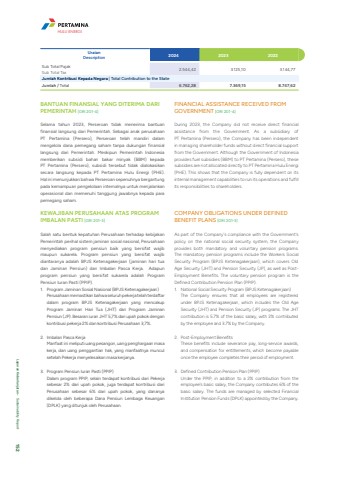 HULU ENERGILaporan Keberlanjutan %u2022 Sustainability Report 152BANTUAN FINANSIAL YANG DITERIMA DARI PEMERINTAH [GRI 201-4]Selama tahun 2023, Perseroan tidak menerima bantuan finansial langsung dari Pemerintah. Sebagai anak perusahaan PT Pertamina (Persero), Perseroan telah mandiri dalam mengelola dana pemegang saham tanpa dukungan finansial langsung dari Pemerintah. Meskipun Pemerintah Indonesia memberikan subsidi bahan bakar minyak (BBM) kepada PT Pertamina (Persero), subsidi tersebut tidak dialokasikan secara langsung kepada PT Pertamina Hulu Energi (PHE). Hal ini menunjukkan bahwa Perseroan sepenuhnya bergantung pada kemampuan pengelolaan internalnya untuk menjalankan operasional dan memenuhi tanggung jawabnya kepada para pemegang saham.KEWAJIBAN PERUSAHAAN ATAS PROGRAM IMBALAN PASTI [GRI 201-3]Salah satu bentuk kepatuhan Perusahaan terhadap kebijakan Pemerintah perihal sistem jaminan sosial nasional, Perusahaan menyediakan program pensiun baik yang bersifat wajib maupun sukarela. Program pensiun yang bersifat wajib diantaranya adalah BPJS Ketenagakerjaan (jaminan hari tua dan Jaminan Pensiun) dan Imbalan Pasca Kerja. Adapun program pensiun yang bersifat sukarela adalah Program Pensiun Iuran Pasti (PPIP). 1. Program Jaminan Sosial Nasional (BPJS Ketenagakerjaan)Perusahaan memastikan bahwa seluruh pekerja telah terdaftar dalam program BPJS Ketenagakerjaan yang mencakup Program Jaminan Hari Tua (JHT) dan Program Jaminan Pensiun (JP). Besaran iuran JHT 5,7% dari upah pokok dengan kontribusi pekerja 2% dan kontribusi Perusahaan 3,7%. 2. Imbalan Pasca KerjaManfaat ini meliputi uang pesangon, uang penghargaan masa kerja, dan uang penggantian hak, yang manfaatnya muncul setelah Pekerja menyelesaikan masa kerjanya.3. Program Pensiun Iuran Pasti (PPIP)Dalam program PPIP, selain terdapat kontribusi dari Pekerja sebesar 2% dari upah pokok, juga terdapat kontribusi dari Perusahaan sebesar 6% dari upah pokok, yang dananya dikelola oleh beberapa Dana Pensiun Lembaga Keuangan (DPLK) yang ditunjuk oleh Perusahaan.FINANCIAL ASSISTANCE RECEIVED FROM GOVERNMENT [GRI 201-4]During 2023, the Company did not receive direct financial assistance from the Government. As a subsidiary of PT Pertamina (Persero), the Company has been independent in managing shareholder funds without direct financial support from the Government. Although the Government of Indonesia provides fuel subsidies (BBM) to PT Pertamina (Persero), these subsidies are not allocated directly to PT Pertamina Hulu Energi (PHE). This shows that the Company is fully dependent on its internal management capabilities to run its operations and fulfill its responsibilities to shareholders.COMPANY OBLIGATIONS UNDER DEFINED BENEFIT PLANS [GRI 201-3]As part of the Company's compliance with the Government's policy on the national social security system, the Company provides both mandatory and voluntary pension programs. The mandatory pension programs include the Workers Social Security Program (BPJS Ketenagakerjaan), which covers Old Age Security (JHT) and Pension Security (JP), as well as PostEmployment Benefits. The voluntary pension program is the Defined Contribution Pension Plan (PPIP).1. National Social Security Program (BPJS Ketenagakerjaan)The Company ensures that all employees are registered under BPJS Ketenagakerjaan, which includes the Old Age Security (JHT) and Pension Security (JP) programs. The JHT contribution is 5.7% of the basic salary, with 2% contributed by the employee and 3.7% by the Company.2. Post-Employment BenefitsThese benefits include severance pay, long-service awards, and compensation for entitlements, which become payable once the employee completes their period of employment.3. Defined Contribution Pension Plan (PPIP)Under the PPIP, in addition to a 2% contribution from the employee's basic salary, the Company contributes 6% of the basic salary. The funds are managed by selected Financial Institution Pension Funds (DPLK) appointed by the Company.UraianDescription 2024 2023 2022Sub Total PajakSub Total Tax 2.544,42 3.125,10 3.144,77 Jumlah Kontribusi Kepada Negara | Total Contribution to the StateJumlah / Total 6.762,28 7.369,15 8.747,62