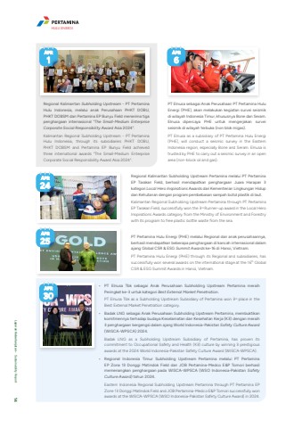 Regional Kalimantan Subholding Upstream - PT Pertamina Hulu Indonesia, melalui anak Perusahaan PHKT DOBU, PHKT DOBSM dan Pertamina EP Bunyu Field menerima tiga penghargaan internasional %u201cThe Small-Medium Enterprise Corporate Social Responsibility Award Asia 2024%u201d.Kalimantan Regional Subholding Upstream - PT Pertamina Hulu Indonesia, through its subsidiaries PHKT DOBU, PHKT DOBSM and Pertamina EP Bunyu Field achieved three international awards %u201cThe Small-Medium Enterprise Corporate Social Responsibility Award Asia 2024%u201d.APR1PT Elnusa sebagai Anak Perusahaan PT Pertamina Hulu Energi (PHE), akan melakukan kegiatan survei seismik di wilayah Indonesia Timur, khususnya Bone dan Seram. Elnusa dipercaya PHE untuk mengerjakan survei seismik di wilayah terbuka (non blok migas).PT Elnusa as a subsidiary of PT Pertamina Hulu Energi (PHE), will conduct a seismic survey in the Eastern Indonesia region, especially Bone and Seram. Elnusa is trusted by PHE to carry out a seismic survey in an open area (non-block oil and gas).APR6Regional Kalimantan Subholding Upstream Pertamina melalui PT Pertamina EP Tarakan Field, berhasil mendapatkan penghargaan Juara Harapan 3 kategori Local Hero Inspirations Awards dari Kementerian Lingkungan Hidup dan Kehutanan dengan program pembebasan sampah botol plastik di laut.Kalimantan Regional Subholding Upstream Pertamina through PT Pertamina EP Tarakan Field, successfully won the 3rd Runner-up award in the Local Hero Inspirations Awards category from the Ministry of Environment and Forestry with its program to free plastic bottle waste from the sea.APR24%u2022 PT Elnusa Tbk sebagai Anak Perusahaan Subholding Upstream Pertamina meraih Peringkat ke-3 untuk kategori Best External Market Penetration.PT Elnusa Tbk as a Subholding Upstream Subsidiary of Pertamina won 3rd place in the Best External Market Penetration category.%u2022 Badak LNG sebagai Anak Perusahaan Subholding Upstream Pertamina, membuktikan komitmennya terhadap budaya Keselamatan dan Kesehatan Kerja (K3) dengan meraih 3 penghargaan bergengsi dalam ajang World Indonesia-Pakistan Safety Culture Award(WISCA-WPSCA) 2024.Badak LNG as a Subholding Upstream Subsidiary of Pertamina, has proven its commitment to Occupational Safety and Health (K3) culture by winning 3 prestigious awards at the 2024 World Indonesia-Pakistan Safety Culture Award (WISCA-WPSCA).%u2022 Regional Indonesia Timur Subholding Upstream Pertamina melalui PT Pertamina EP Zona 13 Donggi Matindok Field dan JOB Pertamina-Medco E&P Tomori berhasil memenangkan penghargaan pada WISCA-WPSCA (WSO Indonesia-Pakistan Safety Culture Award) tahun 2024.Eastern Indonesia Regional Subholding Upstream Pertamina through PT Pertamina EP Zone 13 Donggi Matindok Field and JOB Pertamina-Medco E&P Tomori successfully won awards at the WISCA-WPSCA (WSO Indonesia-Pakistan Safety Culture Award) in 2024.APR30PT Pertamina Hulu Energi (PHE) melalui Regional dan anak perusahaannya, berhasil mendapatkan beberapa penghargaan di kancah internasional dalam ajang Global CSR & ESG Summit Awards ke-16 di Hanoi, Vietnam.PT Pertamina Hulu Energi (PHE) through its Regional and subsidiaries, has successfully won several awards on the international stage at the 16th Global CSR & ESG Summit Awards in Hanoi, Vietnam.APR25HULU ENERGILaporan Keberlanjutan %u2022 Sustainability Report 14