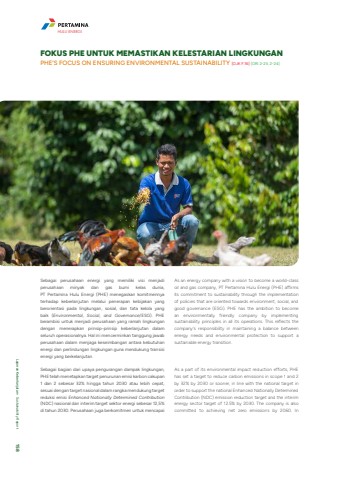 Sebagai perusahaan energi yang memiliki visi menjadi perusahaan minyak dan gas bumi kelas dunia, PT Pertamina Hulu Energi (PHE) menegaskan komitmennya terhadap keberlanjutan melalui penerapan kebijakan yang berorientasi pada lingkungan, sosial, dan tata kelola yang baik (Environmental, Social, and Governance/ESG). PHE berambisi untuk menjadi perusahaan yang ramah lingkungan dengan menerapkan prinsip-prinsip keberlanjutan dalam seluruh operasionalnya. Hal ini mencerminkan tanggung jawab perusahaan dalam menjaga keseimbangan antara kebutuhan energi dan perlindungan lingkungan guna mendukung transisi energi yang berkelanjutan.Sebagai bagian dari upaya pengurangan dampak lingkungan, PHE telah menetapkan target penurunan emisi karbon cakupan 1 dan 2 sebesar 32% hingga tahun 2030 atau lebih cepat, sesuai dengan target nasional dalam rangka mendukung target reduksi emisi Enhanced Nationally Determined Contribution(NDC) nasional dan interim target sektor energi sebesar 12,5% di tahun 2030. Perusahaan juga berkomitmen untuk mencapai As an energy company with a vision to become a world-class oil and gas company, PT Pertamina Hulu Energi (PHE) affirms its commitment to sustainability through the implementation of policies that are oriented towards environment, social, and good governance (ESG). PHE has the ambition to become an environmentally friendly company by implementing sustainability principles in all its operations. This reflects the company's responsibility in maintaining a balance between energy needs and environmental protection to support a sustainable energy transition.As a part of its environmental impact reduction efforts, PHE has set a target to reduce carbon emissions in scope 1 and 2 by 32% by 2030 or sooner, in line with the national target in order to support the national Enhanced Nationally Determined Contribution (NDC) emission reduction target and the interim energy sector target of 12.5% by 2030. The company is also committed to achieving net zero emissions by 2060. In FOKUS PHE UNTUK MEMASTIKAN KELESTARIAN LINGKUNGANPHE%u2019S FOCUS ON ENSURING ENVIRONMENTAL SUSTAINABILITY [OJK F.16] [GRI 2-23, 2-24]HULU ENERGILaporan Keberlanjutan %u2022 Sustainability Report 158