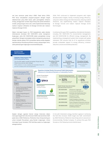 Kebijakan Keberlanjutan PHE PHE Sustainability PolicyCita-cita PHE adalah menjadi perusahaan Minyak dan Gas Global terkemuka dan diakui sebagai: PHE's ambition is to be a leading and reputable Global Oil and Gas company and to be recognized as:Perusahaan Ramah LingkunganEnvironmentallyFriendly CompanyPerusahaan Bertanggung Jawab SosialSocietal Responsible CompanyPerusahaan dengan Tata Kelola yang Baik Good Governance CompanyKomitmen PHEPHE CommitmentKomite Keberlanjutan PHE PHE Sustainability CommiteeKetua ChairpersonCEOAnggotaMembers1. Direktur Perencanaan Strategis & Pengembangan Bisnis Strategic Planning & Bussines Dev. Director2. Direktur Pengembangan & Produksi Development & Production Director3. Direktur Eksplorasi Exploration Director4. Direktur Sumber Daya Manusia dan Layanan Human Resources & Services DirectorStandar PengungkapanDisclosure StandardsPrinsip PanduanGuiding PrinciplesInisiatif InternasionalInternational InitiativesKomitmen Pengurangan EmisiEmission Reduction CommitmentTarget Net ZeroNet Zero Target32% Target Nasional hingga 2030National Target up to 2030~ 0% Target Nasional 2060 National Target 2060Praktik Terbaik International dalamInternational Best Practice in%u2022 ISO 14001:2015 Manajemen LingkunganEnvironmental Management%u2022 ISO 45001:2018 Kesehatan dan Keselamatan KerjaOccupational Health and Safety%u2022 ISO 50001:2018 Manajemen EnergiEnergy Management%u2022 ISO 37001:2017 Sistem Manajemen AntisuapAnti Bribery Management System%u2022 ISO 27001:2022 Sistem Manajemen Keamanan InformasiInformation Security Management System%u2022 ISO 26000:2010 Tanggung Jawab SosialSocial ResponsibilityKepatuhan terhadap Standar Internasional Praktik KeberlanjutanAdherence to International Standards on Sustainability PracticeSejalan dengan agenda transisi energi Indonesia dalam mencapai target Net-Zero Emission (NZE) dan komitmen NZE pada tahun 2060 Pertamina, Pertamina Hulu Energi bertujuan untuk menjadi Perusahaan yang Ramah Lingkungan. Untuk mencapai tujuan tersebut, PHE berfokus pada isu lingkungan sebagai berikut:In line with Indonesia's energy transition agenda in achieving the Net-Zero Emission (NZE) target and NZE commitment by 2060 Pertamina, Pertamina Hulu Energi aims to become an Environmentally Friendly Company. To achieve this goal, PHE focuses on the following environmental issues:2024, PHE continued to implement programs with higher decarbonization targets, namely increasing energy efficiency, using low-carbon energy and heat resources, reducing routine emissions, and implementing Carbon Capture Utilization & Storage (CCUS) and Carbon Capture Storage (CCS) technologies.In achieving this goal, PHE is guided by international standards, including ISO 14001:2015 for environmental management, and ISO 50001:2018 for efficient energy management. By implementing a management system that complies with global standards, PHE ensures that all of its operational activities provide sustainable support to energy efficiency, emission reduction, and environmental protection.net zero emission pada tahun 2060. Pada tahun 2024, PHE terus menjalankan program-program dengan target dekarbonisasi yang lebih besar yakni peningkatan efisiensi energi, penggunaan sumber daya energi dan panas berkarbon rendah, pengurangan emisi rutin, serta implementasi teknologi Carbon Capture Utilization & Storage (CCUS) dan Carbon Capture Storage (CCS).Dalam mencapai tujuan ini, PHE berpedoman pada standar internasional, termasuk ISO 14001:2015 untuk manajemen lingkungan, serta ISO 50001:2018 dalam pengelolaan energi yang efisien. Dengan menerapkan sistem manajemen yang sesuai dengan standar global, PHE memastikan bahwa setiap kegiatan operasionalnya mendukung efisiensi energi, pengurangan emisi, serta perlindungan lingkungan secara berkelanjutan.0102030405060708 PHE's Commitment to Maintaining Sustainable Environment Komitmen PHE dalam Menjaga Lingkungan Lestari091011 PT Pertamina Hulu Energi 159