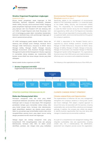 Struktur Organisasi Pengelolaan Lingkungan [SASB EM-EP-160a.1]Khusus terkait pengelolaan aspek lingkungan di PHE Subholding Upstream dijalankan berdasarkan Kebijakan Health, Safety, Security, and Environment (HSSE). Tanggung jawab pengelolaan lingkungan berada di bawah Fungsi HSSE yang dipimpin oleh Vice President (VP) dan didukung oleh unit HSSE di tingkat Regional serta Anak Perusahaan. Unitunit ini bertanggung jawab dalam memastikan keselamatan, keamanan, kesehatan kerja, serta perlindungan lingkungan di seluruh operasional perusahaan.VP HSSE bertanggung jawab kepada Direktur Utama dan didukung oleh berbagai posisi strategis, termasuk Senior Manager HSSE Performance, Assurance & ERCM; Senior Manager Safety; Manager Health; Manager Security; Manager Environment; serta Assistant Manager Planning, Management System & Risk Management. Struktur organisasi ini memastikan bahwa kebijakan dan implementasi HSSE berjalan secara efektif dan sesuai dengan standar yang telah ditetapkan.Berikut adalah struktur organisasi unit HSSE:STRATEGI DAMPAK PERUBAHAN IKLIMRisiko dan Peluang terkait IklimPenerapan manajemen risiko dan krisis yang efektif memperkuat ketahanan perusahaan, baik dalam menghadapi tantangan saat ini maupun di masa depan. PHE mengadopsi pendekatan berlapis guna memastikan bahwa setiap risiko yang terkait dengan bisnis, termasuk risiko keberlanjutan, dapat diidentifikasi, dipahami, dan dikelola secara optimal. Selain itu, perusahaan juga memanfaatkan analisis risiko untuk mengidentifikasi peluang bisnis yang dapat muncul seiring dengan perubahan kondisi industri dan lingkungan.Sebagai bagian dari strategi manajemen risiko yang komprehensif, PHE mengintegrasikan risiko dan peluang keberlanjutan, termasuk risiko iklim, ke dalam proses identifikasi, penilaian, dan mitigasi risiko yang melibatkan CLIMATE CHANGE IMPACT STRATEGYClimate-related Risks and OpportunitiesThe implementation of effective risk and crisis management strengthens the company%u2019s resilience, in facing both current and future challenges. PHE adopts a layered approach to ensure that every risk associated with the business, including sustainability risks, can be identified, understood, and managed optimally. In addition, the company also utilizes risk analysis to identify business opportunities that may arise along with changes in industrial and environmental conditions.As a part of a comprehensive risk management strategy, PHE integrates sustainability risks and opportunities, including climate risks, into a multidisciplinary risk identification, assessment and mitigation process across the organization. Vice President HSSEAssistant Manager HSSE, Planning. MS & RMManager SecurityManager HealthSenior Manager Performance, Assurance & ERCMSenior ManagerSafetyManager EnvironmentEnvironmental Management Organizational Structure [SASB EM-EP-160a.1]Specifically related to the management of environmental aspects at PHE Subholding Upstream, it is conducted based on the Health, Safety, Security, and Environment (HSSE) Policy. The responsibility for environmental management is under the HSSE Function led by the Vice President (VP) and supported by HSSE units at the Regional and Subsidiary levels. These units are responsible for ensuring safety, security, occupational health, and environmental protection throughout the company%u2019s operations.VP HSSE is responsible to the President Director and is supported by various strategic positions, including Senior Manager of HSSE Performance, Assurance & ERCM; Senior Manager of Safety; Manager of Health; Manager of Security; Manager of Environment; and Assistant Manager of Planning, Management System & Risk Management. This organizational structure ensures that HSSE policies and implementations run effectively and in accordance with established standards.The following is the organizational structure of the HSSE unit:Struktur Organisasi Unit HSSEOrganizational Structure of the HSSE Unit HULU ENERGILaporan Keberlanjutan %u2022 Sustainability Report 166