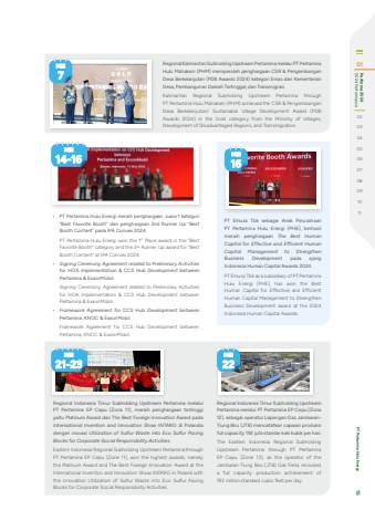 Regional Kalimantan Subholding Upstream Pertamina melalui PT Pertamina Hulu Mahakam (PHM) memperoleh penghargaan CSR & Pengembangan Desa Berkelanjutan (PDB Awards 2024) kategori Emas dari Kementerian Desa, Pembangunan Daerah Tertinggal, dan Transmigrasi.Kalimantan Regional Subholding Upstream Pertamina through PT Pertamina Hulu Mahakam (PHM) achieved the CSR & Pengembangan Desa Berkelanjutan/ Sustainable Village Development Award (PDB Awards 2024) in the Gold category from the Ministry of Villages, Development of Disadvantaged Regions, and Transmigration.%u2022 PT Pertamina Hulu Energi meraih penghargaan Juara 1 kategori %u201cBest Favorite Booth%u201d dan penghargaan 2nd Runner Up %u201cBest Booth Content%u201d pada IPA Convex 2024.PT Pertamina Hulu Energi won the 1st Place award in the %u201cBest Favorite Booth%u201d category and the 2nd Runner Up award for %u201cBest Booth Content%u201d at IPA Convex 2024.%u2022 Signing Ceremony Agreement related to Preliminary Activities for HOA Implementation & CCS Hub Development betweenPertamina & ExxonMobil.Signing Ceremony Agreement related to Preliminary Activities for HOA Implementation & CCS Hub Development between Pertamina & ExxonMobil.%u2022 Framework Agreement for CCS Hub Development betweenPertamina, KNOC & ExxonMobil.Framework Agreement for CCS Hub Development between Pertamina, KNOC & ExxonMobil.Regional Indonesia Timur Subholding Upstream Pertamina melalui PT Pertamina EP Cepu (Zona 11), meraih penghargaan tertinggi yaitu Platinum Award dan The Best Foreign Innovation Award pada International Invention and Innovation Show INTARG di Polandia dengan inovasi Utilization of Sulfur Waste into Eco Sulfur Paving Blocks for Corporate Social Responsibility Activities.Eastern Indonesia Regional Subholding Upstream Pertamina through PT Pertamina EP Cepu (Zone 11), won the highest awards, namely the Platinum Award and The Best Foreign Innovation Award at the International Invention and Innovation Show INTARG in Poland with the innovation Utilization of Sulfur Waste into Eco Sulfur Paving Blocks for Corporate Social Responsibility Activities.PT Elnusa Tbk sebagai Anak Perusahaan PT Pertamina Hulu Energi (PHE), berhasil meraih penghargaan The Best Human Capital for Effective and Efficient Human Capital Management to Strengthen Business Development pada ajang Indonesia Human Capital Awards 2024.PT Elnusa Tbk as a subsidiary of PT Pertamina Hulu Energi (PHE), has won the Best Human Capital for Effective and Efficient Human Capital Management to Strengthen Business Development award at the 2024 Indonesia Human Capital Awards.Regional Indonesia Timur Subholding Upstream Pertamina melalui PT Pertamina EP Cepu (Zona 12), sebagai operator Lapangan Gas JambaranTiung Biru (JTB) mencatatkan capaian produksi full capacity 192 juta standar kaki kubik per hari.The Eastern Indonesia Regional Subholding Upstream Pertamina through PT Pertamina EP Cepu (Zone 12), as the operator of the Jambaran-Tiung Biru (JTB) Gas Field, recorded a full capacity production achievement of 192 million standard cubic feet per day.MEI14-16MEI21-23MEI7MEI16MEI2201 2024 Performance Performa 202402030405060708091011 PT Pertamina Hulu Energi 15