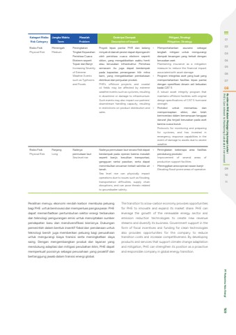 Peralihan menuju ekonomi rendah karbon membuka peluang bagi PHE untuk berinovasi dan memperluas pangsa pasar. PHE dapat memanfaatkan pertumbuhan sektor energi terbarukan dan teknologi pengurangan emisi untuk menciptakan sumber pendapatan baru dan mendiversifikasi bisnisnya. Dukungan pemerintah dalam bentuk insentif fiskal dan pendanaan untuk teknologi bersih juga memberikan peluang bagi perusahaan untuk mengurangi biaya transisi serta meningkatkan daya saing. Dengan mengembangkan produk dan layanan yang mendukung adaptasi dan mitigasi perubahan iklim, PHE dapat memperkuat posisinya sebagai perusahaan yang proaktif dan bertanggung jawab dalam transisi energi global.Kategori RisikoRisk CategoryJangka WaktuTermMasalahProblemDeskripsi Dampak Description of ImpactMitigasi, StrategiMitigation, StrategyRisiko FisikPhysical RiskMenengahMediumPeningkatan Tingkat Keparahan Peristiwa Cuaca Ekstrem seperti Topan dan BanjirIncreasing Severity of Extreme Weather Events such as Typhoons and FloodsProyek lepas pantai PHR dan ladang minyak di daerah pesisir dapat dipengaruhi oleh peristiwa cuaca ekstrem seperti siklon, yang mengakibatkan waktu henti atau kerusakan infrastruktur. Peristiwa semacam itu juga dapat berdampak pada kapasitas penanganan hilir mitra kami, yang mengakibatkan pembatasan distribusi dan penjualan produk.PHR%u2019s offshore projects and coastal oil fields may be affected by extreme weather events such as cyclones, resulting in downtime or damage to infrastructure. Such events may also impact our partners%u2019 downstream handling capacity, resulting in restrictions on product distribution and sales.%u2022 Mempertahankan asuransi sebagai langkah mitigasi untuk mengurangi dampak keuangan yang terkait dengan kerusakan aset.Maintaining insurance as a mitigation measure to reduce the financial impact associated with asset damage%u2022 Program integritas aset yang kuat yang mempertahankan fasilitas lepas pantai dengan spesifikasi desain asli kekuatan badai CAT 5A robust asset integrity program that maintains offshore facilities with original design specifications of CAT 5 hurricane strength%u2022 Protokol untuk memantau dan mempersiapkan siklon, dan telah berinvestasi dalam kemampuan tanggap darurat jika terjadi kerusakan pada aset karena cuaca buruk.Protocols for monitoring and preparing for cyclones, and has invested in emergency response capabilities in the event of damage to assets due to severe weatherRisiko FisikPhysical RiskPanjangLongNaiknya permukaan lautSea level riseNaiknya permukaan laut secara fisik dapat berdampak pada operasi karena masalah seperti banjir, kesulitan transportasi, gangguan rantai pasokan, serta dapat menimbulkan ancaman terkait salinitas air tanah.Sea level rise can physically impact operations due to issues such as flooding, transportation difficulties, supply chain disruptions, and can pose threats related to groundwater salinity.%u2022 Peningkatan beberapa area fasilitas pendukung produksiImprovement of several areas of production support facilities%u2022 Meninggikan area operasi rawan banjirElevating flood-prone areas of operationThe transition to a low-carbon economy provides opportunities for PHE to innovate and expand its market share. PHE can leverage the growth of the renewable energy sector and emission reduction technologies to create new revenue streams and diversify its business. Government support in the form of fiscal incentives and funding for clean technologies also provides opportunities for the company to reduce transition costs and increase competitiveness. By developing products and services that support climate change adaptation and mitigation, PHE can strengthen its position as a proactive and responsible company in global energy transition.0102030405060708 PHE's Commitment to Maintaining Sustainable Environment Komitmen PHE dalam Menjaga Lingkungan Lestari091011 PT Pertamina Hulu Energi 169