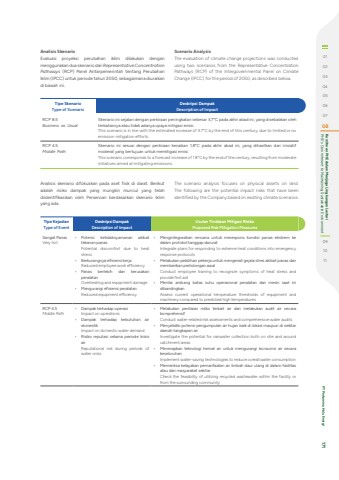 Tipe SkenarioType of ScenarioDeskripsi DampakDescription of ImpactRCP 8.5Business as UsualSkenario ini sejalan dengan perkiraan peningkatan sebesar 3,7%u00b0C pada akhir abad ini, yang disebabkan oleh terbatasnya atau tidak adanya upaya mitigasi emisi.This scenario is in line with the estimated increase of 3.7%u00b0C by the end of this century, due to limited or no emission mitigation efforts.RCP 4.5Middle PathSkenario ini sesuai dengan perkiraan kenaikan 1,8%u00b0C pada akhir abad ini, yang dihasilkan dari inisiatif moderat yang bertujuan untuk memitigasi emisi.This scenario corresponds to a forecast increase of 1.8%u00b0C by the end of the century, resulting from moderate initiatives aimed at mitigating emissions.Analisis skenario difokuskan pada aset fisik di darat. Berikut adalah risiko dampak yang mungkin muncul yang telah diidentifikasikan oleh Perseroan berdasarkan skenario iklim yang ada.The scenario analysis focuses on physical assets on land. The following are the potential impact risks that have been identified by the Company based on existing climate scenarios.Analisis SkenarioEvaluasi proyeksi perubahan iklim dilakukan dengan menggunakan dua skenario dari Representative Concentration Pathways (RCP) Panel Antarpemerintah tentang Perubahan Iklim (IPCC) untuk periode tahun 2050, sebagaimana diuraikan di bawah ini.Tipe KejadianType of EventDeskripsi DampakDescription of ImpactUsulan Tindakan Mitigasi RisikoProposed Risk Mitigation MeasuresSangat PanasVery hot%u2022 Potensi ketidaknyamanan akibat tekanan panasPotential discomfort due to heat stress%u2022 Berkurangnya efisiensi kerjaReduced employee work efficiency%u2022 Panas berlebih dan kerusakan peralatanOverheating and equipment damage%u2022 Mengurangi efisiensi peralatanReduced equipment efficiency %u2022 Mengintegrasikan rencana untuk merespons kondisi panas ekstrem ke dalam protokol tanggap daruratIntegrate plans for responding to extreme heat conditions into emergency response protocols%u2022 Melakukan pelatihan pekerja untuk mengenali gejala stres akibat panas dan memberikan pertolongan awalConduct employee training to recognize symptoms of heat stress and provide first aid%u2022 Menilai ambang batas suhu operasional peralatan dan mesin saat ini dibandingkanAssess current operational temperature thresholds of equipment and machinery compared to predicted high temperaturesRCP 4.5Middle Path%u2022 Dampak terhadap operasiImpact on operations%u2022 Dampak terhadap kebutuhan air domestikImpact on domestic water demand%u2022 Risiko reputasi selama periode krisis airReputational risk during periods of water crisis%u2022 Melakukan penilaian risiko terkait air dan melakukan audit air secara komprehensifConduct water-related risk assessments and comprehensive water audits%u2022 Menyelidiki potensi pengumpulan air hujan baik di lokasi maupun di sekitar daerah tangkapan airInvestigate the potential for rainwater collection both on site and around catchment areas%u2022 Menerapkan teknologi hemat air untuk mengurangi konsumsi air secara keseluruhanImplement water-saving technologies to reduce overall water consumption%u2022 Memeriksa kelayakan pemanfaatan air limbah daur ulang di dalam fasilitas atau dari masyarakat sekitarCheck the feasibility of utilizing recycled wastewater within the facility or from the surrounding communityScenario AnalysisThe evaluation of climate change projections was conducted using two scenarios from the Representative Concentration Pathways (RCP) of the Intergovernmental Panel on Climate Change (IPCC) for the period of 2050, as described below.0102030405060708 PHE's Commitment to Maintaining Sustainable Environment Komitmen PHE dalam Menjaga Lingkungan Lestari091011 PT Pertamina Hulu Energi 171