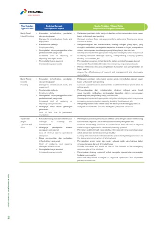 Tipe KejadianType of EventDeskripsi DampakDescription of ImpactUsulan Tindakan Mitigasi RisikoProposed Risk Mitigation MeasuresBanjir DaratInland Flooding%u2022 Kerusakan infrastruktur, peralatan, dan perlengkapanDamage to infrastructure, tools, and equipment%u2022 Keselamatan pekerjaEmployee safety%u2022 Peningkatan biaya penggantian atau perbaikan aset yang rusakIncreased cost of replacing or repairing damaged assets%u2022 Peningkatan biaya asuransiIncreased insurance costs%u2022 Melakukan penilaian risiko banjir di daratan untuk menentukan zona rawan banjir untuk aset-aset pentingConduct onshore flood risk assessments to determine flood-prone zones for critical assets%u2022 Mengembangkan dan melaksanakan strategi mitigasi yang tepat, yang mungkin melibatkan peningkatan kapasitas drainase air hujan, memperkuat sistem pemompaan, membangun penghalang banjir, dan lain-lainDevelop and implement appropriate mitigation strategies, which may involve increasing rainwater drainage capacity, strengthening pumping systems, building flood barriers, etc%u2022 Memasukkan ancaman terkait banjir ke dalam protokol tanggap daruratIncorporate flood-related threats into emergency response protocols%u2022 Menilai efektivitas rencana pengelolaan tumpahan dan pengendalian air hujan saat iniAssess the effectiveness of current spill management and stormwater control plansBanjir PesisirCoastal Flooding%u2022 Kerusakan infrastruktur, peralatan, dan perlengkapanDamage to infrastructure, tools, and equipment%u2022 Keselamatan pekerjaEmployee safety%u2022 Peningkatan biaya penggantian atau perbaikan aset yang rusakIncreased cost of replacing or repairing damaged assets%u2022 Hilangnya lahan akibat genangan permanenLoss of land due to permanent inundation%u2022 Melakukan penilaian risiko banjir pesisir untuk menentukan daerah rawan banjir untuk aset-aset pentingConduct coastal flood risk assessments to determine flood-prone areas for critical assets%u2022 Mengembangkan dan melaksanakan strategi mitigasi yang tepat, yang mungkin melibatkan peningkatan kapasitas sistem pemompaan, pembangunan penghalang banjir, dan lain-lainDevelop and implement appropriate mitigation strategies, which may involve increasing pumping system capacity, building flood barriers, etc%u2022 Mengintegrasikan risiko terkait banjir ke dalam protokol tanggap daruratIntegrate flood-related risks into emergency response protocolsTopan dan AnginTyphoon and Wind%u2022 Kerusakan bangunan dan infrastrukturDamage to buildings and infrastructure%u2022 Hilangnya pendapatan karena gangguan operasionalLoss of revenue due to operational disruption%u2022 Biaya penggantian dan perbaikan infrastruktur yang rusakCost of replacing and repairing damaged infrastructure%u2022 Peningkatan biaya asuransiIncreased insurance costs%u2022 Menetapkan protokol pemantauan bekerja sama dengan badan meteorologi nasional atau regional untuk menciptakan sistem peringatan diniEstablish monitoring protocols in collaboration with national or regional meteorological agencies to create early warning systems%u2022 Mematuhi praktik terbaik nasional atau internasional mengenai beban angin untuk desain dan konstruksi semua strukturComply with national or international best practices regarding wind loads for the design and construction of all structures%u2022 Memasukkan angin topan dan angin sebagai salah satu bahaya dalam rencana tanggap darurat di tingkat lokasiInclude hurricanes and winds as one of the hazards in the emergency response plan at the site level%u2022 Merumuskan strategi responsif untuk mengatur operasi dan menerapkan tindakan pencegahanFormulate responsive strategies to organize operations and implement preventive measuresHULU ENERGILaporan Keberlanjutan %u2022 Sustainability Report 172