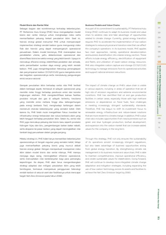 Model Bisnis dan Rantai NilaiSebagai bagian dari komitmennya terhadap keberlanjutan, PT Pertamina Hulu Energi (PHE) terus mengadaptasi model bisnis dan rantai nilainya untuk menghadapi risiko serta memanfaatkan peluang terkait perubahan iklim. Saat ini, transisi energi global menuntut PHE untuk mempercepat implementasi strategi rendah karbon guna mengurangi risiko fisik dan transisi yang dapat mempengaruhi operasional perusahaan. Dalam model bisnisnya, PHE menerapkan dua pendekatan utama, yaitu dekarbonisasi operasional dan diversifikasi bisnis ke sektor energi yang lebih bersih. Upaya ini mencakup efisiensi energi, elektrifikasi peralatan dan armada, serta pemanfaatan sumber daya energi yang lebih rendah karbon. PHE juga mengintegrasikan teknologi penangkapan dan penyimpanan karbon (CCS/CCUS) guna mengelola emisi dari kegiatan operasionalnya serta mendukung pengurangan emisi secara nasional.Dampak perubahan iklim terhadap rantai nilai PHE terlihat dalam berbagai aspek, termasuk di wilayah operasional yang memiliki risiko tinggi terhadap peraturan emisi dan kondisi lingkungan ekstrem. PHE mengidentifikasi bahwa fasilitas produksi minyak dan gas di wilayah tertentu, terutama yang memiliki emisi metana tinggi atau ketergantungan pada energi berbasis fosil, menghadapi tantangan dalam memenuhi standar keberlanjutan yang semakin ketat. Oleh karena itu, PHE telah mulai mengalihkan fokus investasi ke infrastruktur energi terbarukan dan solusi berbasis alam yang lebih tangguh terhadap perubahan iklim. Selain itu, rantai nilai PHE juga mencakup peluang dari bisnis baru seperti produksi hidrogen hijau dan biru, pengembangan bahan bakar nabati, serta ekspansi ke pasar karbon yang dapat meningkatkan nilai tambah bagi perusahaan dalam jangka panjang.Melalui strategi ini, PHE tidak hanya memastikan keberlanjutan operasionalnya di tengah regulasi yang semakin ketat, tetapi juga memanfaatkan peluang bisnis yang muncul akibat transisi energi global. Dengan memperkuat manajemen risiko iklim dalam model bisnis dan rantai nilainya, PHE mampu menjaga daya saing, meningkatkan efisiensi operasional, serta menciptakan nilai berkelanjutan bagi para pemangku kepentingan. Ke depan, PHE akan terus mengembangkan strategi adaptasi dan mitigasi perubahan iklim yang lebih terintegrasi, termasuk memperluas penggunaan teknologi rendah karbon di seluruh aset dan fasilitasnya untuk mencapai target Net Zero Emission pada tahun 2060.Business Models and Value ChainsAs a part of its commitment to sustainability, PT Pertamina Hulu Energi (PHE) continues to adapt its business model and value chain to address risks and take advantage of opportunities related to climate change. Currently, global energy transition requires PHE to accelerate the implementation of low-carbon strategies to reduce physical and transition risks that can affect the company%u2019s operations. In its business model, PHE applies two main approaches, namely operational decarbonization and business diversification into cleaner energy sectors. These efforts include energy efficiency, electrification of equipment and fleets, and utilization of lower-carbon energy resources. PHE also integrates carbon capture and storage (CCS/CCUS) technology to manage emissions from its operational activities and support national emission reductions.The impact of climate change on PHE%u2019s value chain is visible in various aspects, including in areas of operation that are at high risk of emission regulations and extreme environmental conditions. PHE has identified that oil and gas production facilities in certain areas, especially those with high methane emissions or dependence on fossil fuels, face challenges in meeting increasingly stringent sustainability standards. Therefore, PHE has begun to shift its investment focus to renewable energy infrastructure and nature-based solutions that are more resilient to climate change. In addition, PHE%u2019s value chain also includes opportunities from new businesses such as green and blue hydrogen production, biofuel development, and expansion into the carbon market that can increase added values for the company in the long term.Through this strategy, PHE not only ensures the sustainability of its operations amidst increasingly stringent regulations, but also takes advantage of business opportunities arising from global energy transition. By strengthening climate risk management in its business model and value chain, PHE is able to maintain competitiveness, improve operational efficiency, and create sustainable values for stakeholders. Going forward, PHE will continue to develop more integrated climate change adaptation and mitigation strategies, including expanding the use of low-carbon technology across its assets and facilities to achieve the Net Zero Emission target by 2060.0102030405060708 PHE's Commitment to Maintaining Sustainable Environment Komitmen PHE dalam Menjaga Lingkungan Lestari091011 PT Pertamina Hulu Energi 173