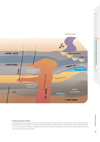 Cap rockU%u03b1 %u03b2%u03b3%u0398ThH2H2OH2 H2OOlivineMeteroic fluidsCCM transportCircularDepressions Surface seepMicrobial reactionSaltSedimentary rock layersReservoir rockAqui%u001aerHydrogen trap(transient?)Hydrogen trapHydrogen trap (long-term?) (transient?)Hydrogen trapPalaeochannels> MaDi%u0019usionDi%u0019usion Di%u0019usionAbioticFault consumption MONTHSDAYS -HOURS - DAYS> 1000YEARSDAYS - MONTHS1 -1000 YEARSYEARS - KaYEARS - KaHOURS - DAYS> 1000 YEARSDAYSMeteroic fluidsin%u001altrationBasement rocks Fe-rich mantle rocksMa - YEARSFe-rich igneous rocksHidrogenHydrogenAirWaterStrategy and Decision MakingIn managing climate change risks, PHE focuses on reducing greenhouse gas emissions, investing in low-carbon technologies, and increasing the capacity to adapt to the impacts of climate change. The implementation of a comprehensive decarbonization strategy is a concrete step by the company in supporting the government%u2019s efforts to achieve net zero emissions, while strengthening PHE%u2019s role in the sustainable energy transition.0102030405060708 PHE's Commitment to Maintaining Sustainable Environment Komitmen PHE dalam Menjaga Lingkungan Lestari091011 PT Pertamina Hulu Energi 177