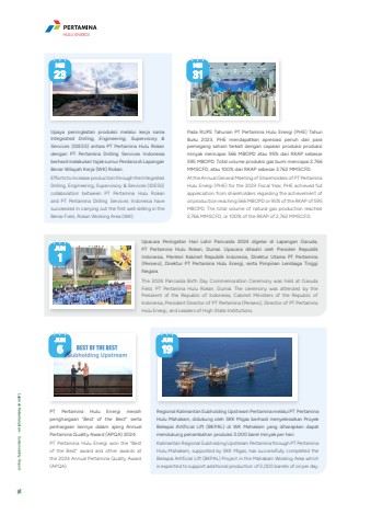 Pada RUPS Tahunan PT Pertamina Hulu Energi (PHE) Tahun Buku 2023, PHE mendapatkan apresiasi penuh dari para pemegang saham terkait dengan capaian produksi produksi minyak mencapai 566 MBOPD atau 95% dari RKAP sebesar 595 MBOPD. Total volume produksi gas bumi mencapai 2.766 MMSCFD, atau 100% dari RKAP sebesar 2.762 MMSCFD.At the Annual General Meeting of Shareholders of PT Pertamina Hulu Energi (PHE) for the 2023 Fiscal Year, PHE achieved full appreciation from shareholders regarding the achievement of oil production reaching 566 MBOPD or 95% of the RKAP of 595 MBOPD. The total volume of natural gas production reached 2,766 MMSCFD, or 100% of the RKAP of 2,762 MMSCFD.MEI23MEI31Upaya peningkatan produksi melalui kerja sama Integrated Drilling, Engineering, Supervisory & Services (IDESS) antara PT Pertamina Hulu Rokan dengan PT Pertamina Drilling Services Indonesia berhasil melakukan tajak sumur Perdana di Lapangan Benar Wilayah Kerja (WK) Rokan.Efforts to increase production through the Integrated Drilling, Engineering, Supervisory & Services (IDESS) collaboration between PT Pertamina Hulu Rokan and PT Pertamina Drilling Services Indonesia have succeeded in carrying out the first well drilling in the Benar Field, Rokan Working Area (WK).Upacara Peringatan Hari Lahir Pancasila 2024 digelar di Lapangan Garuda, PT Pertamina Hulu Rokan, Dumai. Upacara dihadiri oleh Presiden Republik Indonesia, Menteri Kabinet Republik Indonesia, Direktur Utama PT Pertamina (Persero), Direktur PT Pertamina Hulu Energi, serta Pimpinan Lembaga Tinggi Negara.The 2024 Pancasila Birth Day Commemoration Ceremony was held at Garuda Field, PT Pertamina Hulu Rokan, Dumai. The ceremony was attended by the President of the Republic of Indonesia, Cabinet Ministers of the Republic of Indonesia, President Director of PT Pertamina (Persero), Director of PT Pertamina Hulu Energi, and Leaders of High State Institutions.JUN1PT Pertamina Hulu Energi meraih penghargaan %u201cBest of the Best%u201d serta perhargaan lainnya dalam ajang Annual Pertamina Quality Award (APQA) 2024.PT Pertamina Hulu Energi won the %u201cBest of the Best%u201d award and other awards at the 2024 Annual Pertamina Quality Award (APQA).JUN6Regional Kalimantan Subholding Upstream Pertamina melalui PT Pertamina Hulu Mahakam, didukung oleh SKK Migas berhasil menyelesaikan Proyek Bekapai Artificial Lift (BKPAL) di WK Mahakam yang diharapkan dapat mendukung penambahan produksi 2.000 barel minyak per hari.Kalimantan Regional Subholding Upstream Pertamina through PT Pertamina Hulu Mahakam, supported by SKK Migas, has successfully completed the Bekapai Artificial Lift (BKPAL) Project in the Mahakam Working Area which is expected to support additional production of 2,000 barrels of oil per day.JUN19HULU ENERGILaporan Keberlanjutan %u2022 Sustainability Report 16