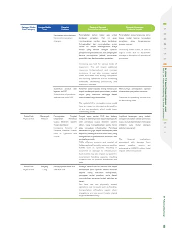 Kategori RisikoRisk CategoryJangka WaktuTermMasalahProblemDeskripsi DampakDescription of ImpactDampak KeuanganFinancial ImpactPerubahan suhu ekstremExtreme temperature changesPeningkatan bahan bakar gas untuk berbagai peralatan. Hal ini akan membutuhkan sumber daya tambahan (infrastruktur) dan meningkatkan emisi. Selain itu dapat meningkatkan biaya modal yang terkait dengan operasi pengeboran,penyelesaian, dan pengerjaan karena peningkatan jadwal, penurunan produktivitas, dan kerusakan peralatan.Increasing gas fuel for various kinds of equipment. This will require additional resources (infrastructure) and increase emissions. It can also increase capital costs associated with drilling, completion and working operations due to increasing schedules, decreasing productivity and equipment damagePeningkatan biaya langsung, serta biaya modal karena kerusakan peralatan atau terganggunya proses operasiIncreasing direct costs, as well as capital costs due to equipment damage or disruption of operational processesSubstitusi produk dan layanan ke EBTSubstitution of products and services with NRE Peralihan pasar kepada energi terbarukan dapat berdampak pada permintaan produk migas yang menurun sehingga dapat menurunkan harga komoditas.The market shift to renewable energy could have an impact on decreasing demand for oil and gas products, which could lower commodity prices.Menurunnya pendapatan operasi dikarenakan penjualan menurun.Decrease in operating income due to decreasing salesRisiko FisikPhysical RiskMenengahMediumPeningkatan Tingkat Keparahan Peristiwa Cuaca Ekstrem seperti Topan dan BanjirIncreasing Severity of Extreme Weather Events such as Typhoons and FloodsProyek lepas pantai PHR dan ladang minyak di daerah pesisir dapat dipengaruhi oleh peristiwa cuaca ekstrem seperti siklon, yang mengakibatkan waktu henti atau kerusakan infrastruktur. Peristiwa semacam itu juga dapat berdampak pada kapasitas penanganan hilir mitra kami, yang mengakibatkan pembatasan distribusi dan penjualan produk.PHR%u2019s offshore projects and coastal oil fields may be affected by extreme weather events such as cyclones, resulting in downtime or damage to infrastructure. Such events may also impact our partners%u2019 downstream handling capacity, resulting in restrictions on product distribution and sales.Implikasi keuangan yang terkait dengan kerusakan akibat peristiwa cuaca buruk diperkirakan mencapai USD274 juta (total dampak sebelum asuransi)The financial implications associated with damage from severe weather events are estimated at USD274 million (total impact before insurance)Risiko FisikPhysical RiskPanjangLongNaiknya permukaan lautSea level riseNaiknya permukaan laut secara fisik dapat berdampak pada operasi karena masalah seperti banjir, kesulitan transportasi, gangguan rantai pasokan, serta dapat menimbulkan ancaman terkait salinitas air tanah.Sea level rise can physically impact operations due to issues such as flooding, transportation difficulties, supply chain disruptions, and can pose threats related to groundwater salinity.0102030405060708 PHE's Commitment to Maintaining Sustainable Environment Komitmen PHE dalam Menjaga Lingkungan Lestari091011 PT Pertamina Hulu Energi 181