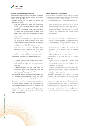 Ketahanan Bisnis terhadap Perubahan IklimStrategi keberlanjutan kami terus menekankan memastikan ketahanan bisnis kami dalam berbagai skenario, dan bertumpu pada tiga aktivitas terkait emisi: 1. Produksi Minyak dan Gas Alam yang Efisien dan Bertanggung Jawab%u2022 Bahan bakar dengan emisi karbon lebih rendah: Sejak 2015, PHE telah mengalihkan bauran produksi ke gas alam, yang merupakan bahan bakar pembakaran yang lebih bersih dibandingkan bahan bakar fosil lainnya. Perusahaan juga memprioritaskan penjualan bahan bakar di dalam negeri guna mengurangi jejak karbon akibat transportasi serta meningkatkan ketahanan energi nasional.%u2022 Bahan bakar yang diproduksi secara bertanggung jawab: PHE berkomitmen untuk memastikan bahwa setiap produk dihasilkan dengan cara yang berkelanjutan, menghormati hak pekerja, serta memperhatikan keterlibatan dan kesejahteraan masyarakat sekitar.%u2022 Transparansi dan pelaporan: Perusahaan telah membangun sistem pelaporan yang kuat dalam pemantauan emisi gas rumah kaca, penggunaan energi, dan indikator lingkungan utama lainnya, yang mendukung pencapaian target pengurangan emisi.2. Implementasi Solusi Efektif untuk Pengurangan Emisi%u2022 Peningkatan efisiensi energi: Berbagai inisiatif efisiensi energi dan optimalisasi operasional diterapkan untuk meminimalkan jejak karbon serta mengurangi emisi gas rumah kaca.%u2022 Penurunan intensitas emisi gas rumah kaca: PHE berkomitmen untuk terus mengurangi emisi yang dihasilkan dari kegiatan produksi, dengan fokus utama pada pengelolaan emisi metana.3. Pengembangan Teknologi dan Inovasi dalam Produksi EnergiPHE secara aktif mengeksplorasi teknologi dan proses baru untuk mengidentifikasi solusi yang dapat diterapkan dalam produksi energi konvensional maupun terbarukan. Perusahaan juga terus mengembangkan keahlian internal di bidang rekayasa, geosains, dan pengeboran guna memperluas pemanfaatan energi alternatif. Inisiatif ini telah dimulai dengan konversi aset minyak dan gas konvensional menjadi sumber energi panas bumi dan hidrogen, sebagai langkah nyata dalam mendukung transisi energi yang lebih bersih dan berkelanjutan.Business Resilience to Climate ChangeOur sustainability strategy continues to emphasize ensuring the resilience of our business across a range of scenarios, and is based on three emissions-related activities:1. Efficient and Responsible Oil and Natural Gas Production%u2022 Lower carbon emission fuels: Since 2015, PHE has shifted its production mix to natural gas, which is a cleaner burning fuel than other fossil fuels. The company also prioritizes domestic fuel sales to reduce the carbon footprint from transportation and increase national energy security.%u2022 Responsibly produced fuel: PHE is committed to ensuring that every product is produced in a sustainable manner, respecting workers%u2019 rights and taking into account the involvement and well-being of local communities.%u2022 Transparency and reporting: The Company has established a robust reporting system in monitoring greenhouse gas emissions, energy use and other key environmental indicators, which supports the achievement of emission reduction targets.2. Implementation of Effective Solutions for Emission Reduction%u2022 Energy efficiency improvements: Various energy efficiency initiatives and operational optimizations are implemented to minimize carbon footprint and reduce greenhouse gas emissions.%u2022 Reducing greenhouse gas emission intensity: PHE is committed to continuously reducing emissions resulting from production activities, with a primary focus on managing methane emissions.3. Technology Development and Innovation in Energy Production PHE actively explores new technologies and processes to identify solutions that can be applied in both conventional and renewable energy production. The company also continues to develop internal expertise in engineering, geoscience, and drilling to expand the use of alternative energy. This initiative has begun with the conversion of conventional oil and gas assets to geothermal and hydrogen energy sources, as a concrete step in supporting a cleaner and more sustainable energy transition.HULU ENERGILaporan Keberlanjutan %u2022 Sustainability Report 182