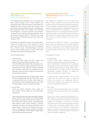 MANAJEMEN RISIKO DAMPAK PERUBAHAN IKLIM [OJK E.3] [GRI 2-25] [TCFD RM-A,B,C] [SASB EM-EP-540a.2]PHE mengintegrasikan pengelolaan risiko dan peluang yang terkait dengan perubahan iklim ke dalam kegiatan yang sedang berlangsung. Risiko dan peluang ini diidentifikasi serta dikategorikan secara sistematis dalam Risk Intelligence Mapdan Pedoman Manajemen Risiko Perusahaan. Proses Enterprise Risk Management (ERM) PHE mengikuti ISO 31000:2018 Risk Management - Principles & Guidelines. Acuan kebijakan manajemen risiko di lingkungan Subholding Upstream, antara lain Pedoman Manajemen Risiko PT Pertamina Hulu Energi, Tata Kerja Organisasi (TKO) dan Tata Kerja Individu (TKI) terkait manajemen risiko.Proses ERM memungkinkan Perusahaan untuk mengidentifikasi, menilai, dan mengelola risiko secara sistematis di seluruh operasi bisnis yang terkait dengan risiko dan peluang berbasis iklim. Terutama dengan mempertimbangkan topik-topik penting, seperti Perubahan Iklim dan transisi rendah karbon yang dapat memengaruhi rantai nilai Perusahaan.Proses Pengelolaan Risiko:1. Identifikasi RisikoFungsi yang terlibat: Kepala Unit Bisnis, Direktur AnakPerusahaan, dan Kepala Divisi Supporting Function.Proses: Identifikasi dan penilaian risiko dan peluang terkaitiklim di seluruh aset PHE melalui pertimbangan situasi, danpengembangan skenario terkait iklim dengan memasukkanlokasi operasional utama PHE dan menerapkan informasiyang diakui secara internasional, misalnya, kemungkinan dan besarnya dampak potensial.Dalam mengidentifikasikan risiko, Koordinator Risiko di setiap unit akan menggabungkan risiko dari Pemilik Risiko khusus di supporting fuction dan unit bisnis. Risiko terkait iklim diidentifikasi (dan dinilai) di berbagai departemen dan dengan mempertimbangkan harapan pemangku kepentingan.2. Analisis RisikoFungsi yang terlibat: Manajemen Risiko, Kepala UnitBisnis, Direktur Anak Perusahaan, dan Tim HSSE, KomiteKeberlanjutan.Proses: Setelah risiko perubahan iklim diidentifikasi, dilakukan analisis mendalam untuk memahami kemungkinan kejadian dan dampaknya terhadap operasional serta strategi bisnis PHE. Analisis risiko dilakukan dengan mempertimbangkan faktor eksternal seperti regulasi lingkungan, perubahan harga karbon, dan faktor cuaca ekstrem, serta faktor internal seperti kesiapan infrastruktur dan ketahanan rantai pasok. Proses ini menggunakan metode kuantitatif dan kualitatif untuk mengklasifikasikan risiko berdasarkan tingkat urgensi dan dampaknya terhadap operasional.CLIMATE CHANGE IMPACT RISK MANAGEMENT [OJK E.3] [GRI 2-25] [TCFD RM-A,B,C][SASB EM-EP-540a.2]PHE integrates the management of risks and opportunities related to climate change into ongoing activities. These risks and opportunities are systematically identified and categorized in the Risk Intelligence Map and Enterprise Risk Management Guidelines. PHE%u2019s Enterprise Risk Management (ERM) process follows ISO 31000:2018 Risk Management - Principles & Guidelines. References for risk management policies within the Subholding Upstream include the Risk Management Guidelines of PT Pertamina Hulu Energi, Organizational Work Procedures (TKO) and Individual Work Procedures (TKI) related to risk management.The ERM process enables the Company to systematically identify, assess and manage risks across business operations related to climate-based risks and opportunities. Particularly considering important topics, such as Climate Change and the low-carbon transition that may impact the Company%u2019s value chain.Risk Management Process:1. Risk IdentificationFunctions involved: Head of Business Unit, Director ofSubsidiary, and Head of Supporting Function Division.Process: Identification and assessment of climate-relatedrisks and opportunities across PHE%u2019s assets through situational considerations, and development of climate-related scenarios incorporating PHE%u2019s key operational locations and applyinginternationally recognised information, for example, thelikelihood and magnitude of potential impacts.In identifying risks, the Risk Coordinator in each unit will combine risks from specific Risk Owners in supporting functions and business units. Climate-related risks are identified (and assessed) across departments and taking into account stakeholder expectations.2. Risk AnalysisFunctions involved: Risk Management, Head of BusinessUnit, Director of Subsidiary, and HSSE Team, SustainabilityCommittee.Process: Once climate change risks are identified, an indepth analysis is conducted to understand the likelihood of occurrence and its impact on PHE%u2019s operations and business strategies. The risk analysis is conducted by considering external factors such as environmental regulations, changes in carbon prices, and extreme weather factors, as well as internal factors such as infrastructure readiness and supply chain resilience. This process uses quantitative and qualitative methods to classify risks based on their level of urgency and impact on operations.0102030405060708 PHE's Commitment to Maintaining Sustainable Environment Komitmen PHE dalam Menjaga Lingkungan Lestari091011 PT Pertamina Hulu Energi 183