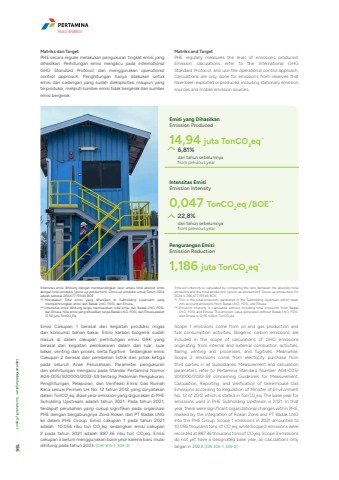 Emisi yang DihasilkanEmission Produced14,94 juta TonCO2eq*6,81%dari tahun sebelumnyafrom previous yearIntensitas EmisiEmission Intensity0,047 TonCO2eq /BOE**22,8%dari tahun sebelumnyafrom previous yearPengurangan EmisiEmission Reduction1,186 juta TonCO2eq*Intensitas emisi dihitung dengan membandingkan rasio antara total absolut emisi dengan total produksi (gross up production). Gross up produksi untuk Tahun 2024 adalah sebesar 266,477,193.46 BOE.*) Merupakan Total emisi yang dihasilkan di Subholding Upstream yang memperhitungkan emisi dari Badak LNG, PDSI, dan Elnusa.**)Intensitas emisi dihitung tanpa memasukkan total emisi dari Badak LNG, PDSI, dan Elnusa. Nilai emisi yang dihasilkan tanpa Badak LNG, PDSI, dan Elnusa adalah 12,56 juta TonCO2Eq.Emission intensity is calculated by comparing the ratio between the absolute total emissions and the total production (gross-up production). Gross-up production for 2024 is 266,477,193.46 BOE.*) This is the total emissions generated in the Subholding Upstream which takesinto account emissions from Badak LNG, PDSI, and Elnusa.**)Emission intensity is calculated without including total emissions from Badak LNG, PDSI, and Elnusa. The emission value generated without Badak LNG, PDSI, and Elnusa is 12.56 million TonCO2eq.Matriks dan TargetPHE secara reguler melakukan pengukuran tingkat emisi yang dihasilkan. Perhitungan emisi mengacu pada InternationalGHG Standard Protocol, dan menggunakan operationalcontrol approach. Penghitungan hanya dilakukan untuk emisi dari cadangan yang sudah dieksploitasi maupun yang terproduksi, meliputi sumber emisi tidak bergerak dan sumber emisi bergerak. Emisi Cakupan 1 berasal dari kegiatan produksi migas dan konsumsi bahan bakar. Emisi karbon biogenik sudah masuk di dalam cakupan perhitungan emisi GRK yang berasal dari kegiatan pembakaran dalam dan luar, suar bakar, venting dan proses, serta fugitive. Sedangkan emisi Cakupan 2 berasal dari pembelian listrik dari pihak ketiga pada seluruh Anak Perusahaan. Parameter pengukuran dan perhitungan mengacu pada Standar Pertamina Nomor A04-005/S00000/2022-S9 tentang Pedoman Pengukuran, Penghitungan, Pelaporan, dan Verifikasi Emisi Gas Rumah Kaca sesuai Permen LH No. 12 tahun 2012 yang dinyatakan dalam TonCO2eq. Base year emission yang digunakan di PHE Suholding Upstream adalah tahun 2021. Pada tahun 2021, terdapat perubahan yang cukup signifikan pada organisasi PHE dengan bergabungnya Zona Rokan dan PT Badak LNG ke dalam PHE Group. Emisi cakupan 1 pada tahun 2021 adalah 10.056 ribu ton CO2eq, sedangkan emisi cakupan 2 pada tahun 2021 adalah 887,36 ribu ton CO2eq. Emisi cakupan 3 belum menggunakan base year karena baru mulai dihitung pada tahun 2023. [GRI 305-1, 305-2]Scope 1 emissions come from oil and gas production and fuel consumption activities. Biogenic carbon emissions are included in the scope of calculations of GHG emissions originating from internal and external combustion activities, flaring, venting and processes, and fugitives. Meanwhile, Scope 2 emissions come from electricity purchase from third parties in all Subsidiaries. Measurement and calculation parameters refer to Pertamina Standard Number A04-005/S00000/2022-S9 concerning Guidelines for Measurement, Calculation, Reporting, and Verification of Greenhouse Gas Emissions according to Regulation of Minister of Environment No. 12 of 2012 which is stated in TonCO2eq. The base year for emissions used in PHE Subholding Upstream is 2021. In that year, there were significant organizational changes within PHE, marked by the integration of Rokan Zone and PT Badak LNG into the PHE Group. Scope 1 emissions in 2021 amounted to 10,056 thousand tons of CO2eq, while Scope 2 emissions were recorded at 887.36 thousand tons of CO2eq. Scope 3 emissions do not yet have a designated base year, as calculations only began in 2023. [GRI 305-1, 305-2]Matriks and TargetPHE regularly measures the level of emissions produced. Emission calculations refer to the International GHG Standard Protocol, and use the operational control approach. Calculations are only done for emissions from reserves that have been exploited or produced, including stationary emission sources and mobile emission sources.HULU ENERGILaporan Keberlanjutan %u2022 Sustainability Report 186
