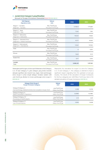 Sedangkan perhitungan untuk scope 3 dilakukan untuk Category 3, 5, 10 dan Category 11, yaitu kategori yang dinilai memiliki dampak signifikan dari industri hulu migas. Hasil perhitungan emisi Scope 3 untuk empat kategori tersebut adalah 3,28 Juta TonCO2eq. Berikut ini rincian perhitungan emisi scope 3:[GRI 305-3]Meanwhile, the calculation for scope 3 is done for Category 3, 5, 10 and Category 11, this category is deemed to have a significant impact originating from the upstream oil and gas industry. The results of the calculation of Scope 3 emissions for the four categories are: 3,28 Million TonCO2eq. Here is the detailed calculation of Scope 3 emissions. [GRI 305-3]Kategori Emisi Scope 3Scope 3 Emission Category SatuanUnit 2024 2023Kategori/Category 3 Fuel and Energy-related Activities (not included in Scope 1 & 2)Juta TonCO2eqMillion TonCO2eq0,199 0,578Kategori/Category 5 Waste Generated in OperationsJuta TonCO2eqMillion TonCO2eq0,0283 0,0385Kategori/Category 10 Processing of Sold ProductsJuta TonCO2eqMillion TonCO2eq2,13 2,49Kategori/Category 11 Use of Sold ProductsJuta TonCO2eqMillion TonCO2eq0,924 0,638Jumlah Emisi Cakupan 2 yang DihasilkanAmount of Scope 2 Emissions Generated [OJK F.11] [GRI 305-2]Unit OperasiOperation UnitsSatuanUnit 2024 2023Region 1 - SumatraRegional 1 - SumatraRibu TonCO2eqThousand TonCO2eq 2.139,13 1.716,89Region 2 - JawaRegional 2 - JavaRibu TonCO2eqThousand TonCO2eq 11,44 7,84Region 3 - KalimantanRegional 3 - KalimantanRibu TonCO2eqThousand TonCO2eq 105,53 59,83Region 4 - Indonesia TimurRegional 4 - Eastern IndonesiaRibu TonCO2eqThousand TonCO2eq 61,77 40,83Region 5 - InternasionalRegional 5 - InternationalRibu TonCO2eqThousand TonCO2eq 141,61 137,26PDSI Ribu TonCO2eqThousand TonCO2eq 0 0,05Elnusa Ribu TonCO2eqThousand TonCO2eq 15,23 9,13Badak NGL Ribu TonCO2eqThousand TonCO2eq 9,77 0,09JumlahTotalRibu TonCO2eqThousand TonCO2eq 2.484,49 1.971,92HULU ENERGILaporan Keberlanjutan %u2022 Sustainability Report 190