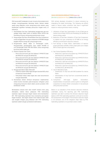 REDUKSI EMISI GRK [OJK F.12] [GRI 305-5] [SASB EM-EP-110a.3] [IPIECA CCE-4, CCE-7]PHE secara aktif melakukan inovasi-inovasi untuk reduksi emisi dengan mengintegrasikan teknologi terkini. Berikut adalah upaya yang dilakukan untuk mengurangi emisi karbon yang berdampak signifikan terhadap penurunan tingkat emisi, di antaranya:1. Pemanfaatan Gas Suar: Optimalisasi penggunaan gas suar sebagai bahan bakar turbin di fasilitas Petani GP/GS dan Pematang GS guna mengurangi pemborosan energi.2. Pengurangan Gas Flare: Pemanfaatan Own Gas Compressor untuk menggantikan mini gas compressor di SP BBS sebagai langkah efisiensi energi dan pengurangan emisi.3. Penghematan Bahan Bakar di Pembangkit Listrik: Pengoptimalan pembangkitan daya reaktif (MVAR) di unit pembangkit listrik PHR WK Rokan untuk mengurangi konsumsi bahan bakar gas.4. Efisiensi Operasi Gas Turbin:%u2022 Penurunan konsumsi gas fuel sebesar 2 MMSCFD (dari 28 MMSCFD menjadi 26 MMSCFD).%u2022 Penurunan konsumsi gas fuel sebesar 6 MMSCFD (dari 40 MMSCFD menjadi 34 MMSCFD).%u2022 Penurunan konsumsi gas fuel sebesar 4 MMSCFD (dari 34 MMSCFD menjadi 30 MMSCFD).%u2022 Penurunan konsumsi gas fuel sebesar 2 MMSCFD (dari 30 MMSCFD menjadi 28 MMSCFD).5. Penggunaan Bahan Bakar Alternatif:%u2022 Substitusi bahan bakar kapal dengan biosolar B35 untuk armada laut (marine fleet).%u2022 Naturalisasi bahan bakar kapal dari solar konvensional menjadi Diesel B35.6. Otomatisasi Sistem Antisure Kompresor: Implementasi sistem kontrol otomatis pada kompresor refrigeran untuk mengurangi konsumsi steam dalam proses produksi LNG bertekanan rendah.Berdasarkan evaluasi kami atas inisiatif reduksi emisi yang diterapkan, selama tahun pelaporan PHE Subholding Upstream dapat mencapai target reduksi emisi berdasarkan KPI. PHE Subholding Upstream terus memantau pencapaian target tersebut. Jika target reduksi emisi tidak tercapai salah satu langkah mitigasi yang dilakukan oleh PHE Subholding Upstream adalah dengan pembelian kredit karbon.GHG EMISSION REDUCTION [OJK F.12][GRI 305-5] [SASB EM-EP-110a.3] [IPIECA CCE-4, CCE-7]PHE actively develops innovations to reduce emissions by integrating the latest technology. The following are efforts made to reduce carbon emissions that have a significant impact on reducing emission levels, including:1. Utilization of Flare Gas: Optimization of use of flare gas as turbine fuel at Petani GP/GS and Pematang GS facilities to reduce energy waste.2. Reduction of Gas Flare: Utilization of Own Gas Compressor to replace mini gas compressor at SP BBS as an energy efficiency and emission reduction measure.3. Fuel Savings in Power Plants: Optimization of reactive power generation (MVAR) in PHR power plant unit in Rokan WA to reduce gas fuel consumption.4. Gas Turbine Operation Efficiency:%u2022 Reduction in gas fuel consumption by 2 MMSCFD (from 28 MMSCFD to 26 MMSCFD).%u2022 Reduction in gas fuel consumption by 6 MMSCFD (from 40 MMSCFD to 34 MMSCFD).%u2022 Reduction in gas fuel consumption by 4 MMSCFD (from 34 MMSCFD to 30 MMSCFD).%u2022 Reduction in gas fuel consumption by 2 MMSCFD (from 30 MMSCFD to 28 MMSCFD).5. Use of Alternative Fuels:%u2022 Substitution of ship fuel with B35 biodiesel for marine fleets.%u2022 Naturalization of ship fuel from conventional diesel to Diesel B35.6. Compressor Anti-surge System Automation: Implementation of automatic control system on refrigerant compressor to reduce steam consumption in low pressure LNG production process.Based on our evaluation of the emission reduction initiatives undertaken, during the reporting year PHE Subholding Upstream was able to achieve the emission reduction target based on KPI. PHE Subholding Upstream continues to monitor the achievement of the target. If the emission reduction target is not achieved, one of the mitigation steps taken by PHE Subholding Upstream is to purchase carbon credits.0102030405060708 PHE's Commitment to Maintaining Sustainable Environment Komitmen PHE dalam Menjaga Lingkungan Lestari091011 PT Pertamina Hulu Energi 191