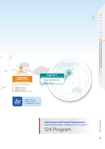 5Regional 4Indonesia TimurEastern IndonesiaArea: 62.942 km2%u2022 Zona 11: 13 Program%u2022 Zona 13: 14 Program%u2022 Zona 14: 2 ProgramRegional 5 Internasional | InternationalArea: 62.942 km2%u2022 Zona 15: 2 Program%u2022 PDSI: 13 Program%u2022 Elnusa: 14 Program%u2022 PT Badak NGL: 7 ProgramTotal Program Aktif Inisiatif DekarbonisasiTotal Decarbonization Initiatives Active Programs124 Program0102030405060708 PHE's Commitment to Maintaining Sustainable Environment Komitmen PHE dalam Menjaga Lingkungan Lestari091011 PT Pertamina Hulu Energi 193