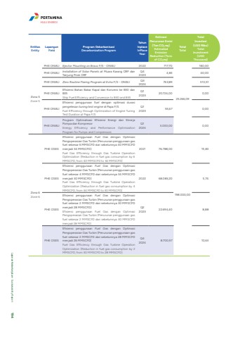 EntitasEntityLapanganFieldProgram Dekarbonisasi Decarbonization ProgramTahun InplaceInPlace YearEstimasi Penurunan Emisi (Ton CO%u2082 eq)Estimated Emission Reduction (Tons of CO%u2082eq)TotalTotalTotal Investasi (USD Ribu)Total Investment (USD Thousand)Zona 5Zone 5PHE ONWJ Ejector Mounting on Bravo F/S - ONWJ 2022 717,7025.266,09180,00PHE ONWJ Installation of Solar Panels at Muara Karang ORF dan Tanjung Priok ORFQ4 2023 4,83 40,00PHE ONWJ Zero Routine Flaring Program at Echo F/S - ONWJ Q3 2024 763,89 510,51PHE ONWJEfisiensi Bahan Bakar Kapal dan Konversi ke B30 dan B35Ship Fuel Efficiency and Conversion to B30 and B35Q1 2023 20.724,00 0,00PHE ONWJEfisiensi penggunaan fuel dengan optimasi durasi pengetesan tuning test engine di Papa F/SFuel Efficiency through Optimization of Engine Tuning Test Duration at Papa F/SQ1 2023 55,67 0,00PHE ONWJProgram Optimalisasi Efisiensi Energi dan Kinerja Pompa dan KompresorEnergy Efficiency and Performance Optimization Program for Pumps and CompressorsQ1 2024 3.000,00 0,00Zona 6Zone 6PHE OSESEfisiensi penggunaan Fuel Gas dengan Optimasi Pengoperasian Gas Turbin (Penurunan penggunaan gas fuel sebesar 6 MMSCFD dari sebelumnya 40 MMSCFD menjadi 34 MMSCFD)Fuel Gas Efficiency through Gas Turbine Operation Optimization (Reduction in fuel gas consumption by 6 MMSCFD, from 40 MMSCFD to 34 MMSCFD)2021 76.788,00198.000,0015,83PHE OSESEfisiensi penggunaan Fuel Gas dengan Optimasi Pengoperasian Gas Turbin (Penurunan penggunaan gas fuel sebesar 4 MMSCFD dari sebelumnya 34 MMSCFD menjadi 30 MMSCFD)Fuel Gas Efficiency through Gas Turbine Operation Optimization (Reduction in fuel gas consumption by 4 MMSCFD, from 34 MMSCFD to 30 MMSCFD)2022 68.083,20 5,74PHE OSESEfisiensi penggunaan Fuel Gas dengan Optimasi Pengoperasian Gas Turbin (Penurunan penggunaan gas fuel sebesar 2 MMSCFD dari sebelumnya 30 MMSCFD menjadi 28 MMSCFD)Efisiensi penggunaan Fuel Gas dengan Optimasi Pengoperasian Gas Turbin (Penurunan penggunaan gas fuel sebesar 2 MMSCFD dari sebelumnya 30 MMSCFD menjadi 28 MMSCFD)Q2 2023 22.694,40 8,88PHE OSESEfisiensi penggunaan Fuel Gas dengan Optimasi Pengoperasian Gas Turbin (Penurunan penggunaan gas fuel sebesar 2 MMSCFD dari sebelumnya 28 MMSCFD menjadi 26 MMSCFD)Fuel Gas Efficiency through Gas Turbine Operation Optimization (Reduction in fuel gas consumption by 2 MMSCFD, from 30 MMSCFD to 28 MMSCFD)Q4 2024 8.700,97 10,63HULU ENERGILaporan Keberlanjutan %u2022 Sustainability Report 194
