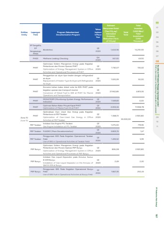 EntitasEntityLapanganFieldProgram Dekarbonisasi Decarbonization ProgramTahun InplaceInPlace YearEstimasi Penurunan Emisi (Ton CO%u2082 eq)Estimated Emission Reduction (Tons of CO%u2082eq)TotalTotalTotal Investasi (USD Ribu)Total Investment (USD Thousand)EP Sangatta, EP Sangasanga, PHSSBorderless Q1 2023 1,444.06 14,210.00PHSS Methane Leaking Checking Q4 2023 341.00 43.00Zona 10Zone 10PHKTOptimisasi Sistem Manajemen Energi pada Kegiatan Perkantoran dan Proses Operasi PHKTOptimization of Energy Management System in Office Activities and Operational Processes at PHKTQ1 2023 1.732,0735.000,00130,02PHKTPenggantian air dryer tipe heater dengan refrigeratedair dryerReplacement of Heater-Type Air Dryer with Refrigerated Air DryerQ1 2023 1.220,09 50,00PHKTKonversi bahan bakar diesel solar ke B35 PHKT pada kegiatan operasi dan transport marineConversion of Diesel Fuel to B35 at PHKT for Marine Operations and TransportationQ1 2023 21.942,85 4.813,55PHKT MONSTERPI (Monitoring System Energy Performance Indicator)Q1 2023 1.549,65 0,00PHKT Optimasi Bahan Bakar Minyak Kapal PHKTOptimization of Marine Fuel Oil at PHKTQ1 2024 2.203,34 11.908,78PHKTOptimalisasi Own Used Gas Energi pada Kegiatan Perkantoran di PEP TarakanOptimization of Own-Used Gas Energy in Office Activities at PEP TarakanQ1 2023 1.068,72 2.920,80PEP Tarakan Instalasi Gas Engine PTL TarakanGas Engine Installation at PTL TarakanQ1 2023 1.275,00 719,95PEP Tarakan FLADEO (Flare Decarbonization) Q1 2023 3.800,15 1,67PEP TarakanPenggunaan B35 Pada Kegiatan Operasional Tarakan FieldUse of B35 in Operational Activities at Tarakan FieldQ1 2024 1.493,52 5,99PEP BunyuOptimisasi Sistem Manajemen Energi pada Kegiatan Perkantoran dan Proses Operasi PEP BunyuOptimization of Energy Management System in Office Activities and Operational Processes at PEP BunyuQ1 2023 806,08 2.920,80PEP BunyuInstalasi Gas Liquid Separator pada Annulus Sumur B-209 BunyuInstallation of Gas-Liquid Separator on the Annulus of Well B-209 at BunyuQ1 2023 2,49 2,30PEP BunyuPenggunaan B35 Pada Kegiatan Operasional Bunyu FieldUse of B35 Fuel in Operational Activities at Bunyu FieldQ1 2024 1.667,35 250,330102030405060708 PHE's Commitment to Maintaining Sustainable Environment Komitmen PHE dalam Menjaga Lingkungan Lestari091011 PT Pertamina Hulu Energi 197