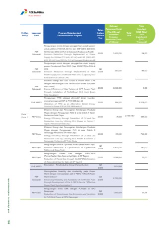 EntitasEntityLapanganFieldProgram Dekarbonisasi Decarbonization ProgramTahun InplaceInPlace YearEstimasi Penurunan Emisi (Ton CO%u2082 eq)Estimated Emission Reduction (Tons of CO%u2082eq)TotalTotalTotal Investasi (USD Ribu)Total Investment (USD Thousand)Zona 11Zone 11PEP SukowatiPengurangan emisi dengan penggantian supply poweruntuk utilities (110 kVA, 60 Hz) dan ESP (DEG 400 kVA, 50 Hz) dari DEG ke PLN di Sukowati Pad A dan Pad BEmission Reduction through Replacement of Power Supply for Utilities (110 kVA, 60 Hz) and ESP (DEG 400 kVA, 50 Hz) from DEG to PLN at Sukowati Pads A and B2022 1.400,0027.557,8728,00PEP SukowatiPengurangan emisi dengan penggantian main supply power Condensat Plant DEG (kap. 500 kVA) ke PLN di CPAEmission Reduction through Replacement of Main Power Supply for Condensate Plant DEG (Capacity 500 kVA) with PLN Grid at CPAQ2 2023 243,00 85,00PEP SukowatiEfisiensi Energi dari Gas Turbin di Power Plant CPA dengan Pemasangan Unit TerSADown (Filter Scrubber Anti Down)Energy Efficiency of Gas Turbine at CPA Power Plant through Installation of TerSADown Unit (Anti-Down Filter Scrubber)2022 6.048,00 3,00PHE WMOPenggunaan MTG sebagai alternatif diesel (sumber energi) penggerak ESP di PHE 38B dan 40Utilization of MTG as an Alternative Diesel Energy Source to Power ESP at PHE 38B and 402022 594,20 2.203,00PEP CepuEfisiensi Energi dari Pencegahan Kehilangan Produksi Migas dengan Penggunaan PLN di area Distrik 1 Tapen Pertamina Field CepuEnergy Efficiency through Prevention of Oil and Gas Production Loss by Utilizing PLN Power in District 1 Tapen, Pertamina Field Cepu2022 76,68 335,00PEP CepuEfisiensi Energi dari Pencegahan Kehilangan Produksi Migas dengan Penggunaan PLN di area Distrik 2 Semanggi Pertamina EP Field CepuEnergy Efficiency through Prevention of Oil and Gas Production Loss by Utilizing PLN Power in District 2 Semanggi, Pertamina EP Field Cepu2022 315,30 759,00PEP CepuPengurangan Emisi & Optimasi Pola Operasi Field CepuEmission Reduction & Optimization of Operational Patterns at Cepu FieldQ1 2023 3.300,00 261,00PEP CepuPengurangan Flared Gas dengan GASOPEN (Pemanfaatan Gas Asso untuk Sales di SP Tapen)Reduction of Flared Gas through GASOPEN (Utilization of Associated Gas for Sales at SP Tapen)2022 3.066,44 17,00PHE WMO Recreation - Rescheduling Crew Change Action Q3 2023 2.614,68PEP SukowatiMeningkatkan Reability dan Availability pada Power Plant dengan menciptakan alat E-PEPSI \Plant Sinkron\Enhancing Reliability and Availability of the Power Plant through Development of the E-PEPSI Device ('Effective Power Plant Synchronization')Q4 2023 2.700,00PEP CepuPengurangan Emisi GRK dengan PLNisasi di SPU KawenganReduction of Greenhouse Gas Emissions via Transition to PLN Grid Power at SPU KawenganQ4 2023 1.545,49 35,79HULU ENERGILaporan Keberlanjutan %u2022 Sustainability Report 198