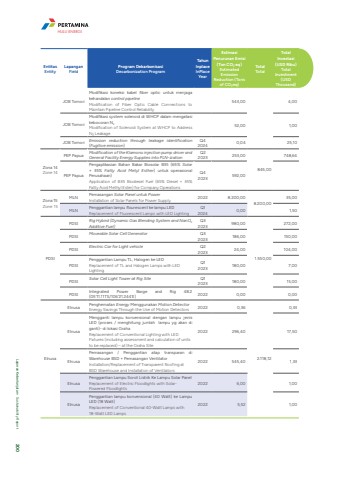 EntitasEntityLapanganFieldProgram Dekarbonisasi Decarbonization ProgramTahun InplaceInPlace YearEstimasi Penurunan Emisi (Ton CO%u2082 eq)Estimated Emission Reduction (Tons of CO%u2082eq)TotalTotalTotal Investasi (USD Ribu)Total Investment (USD Thousand)JOB TomoriModifikasi koneksi kabel fiber optic untuk menjaga kehandalan control pipelineModification of Fiber Optic Cable Connections to Maintain Pipeline Control Reliability543,00 4,00JOB TomoriModifikasi system solenoid di WHCP dalam mengatasi kebocoran N2Modification of Solenoid System at WHCP to Address N%u2082 Leakage52,00 1,00JOB Tomori Emission reduction through leakage identification(Fugitive emission)Q4 2024 0,04 25,10Zona 14Zone 14PEP Papua Modification of the Klamono injection pump driver and General Facility Energy Supplies into PLN-izationQ2 2023 253,00845,00748,64PEP PapuaPengaplikasian Bahan Bakar Biosolar B35 (65% Solar + 35% Fatty Acid Metyl Esther) untuk operasional Perusahaan)Application of B35 Biodiesel Fuel (65% Diesel + 35% Fatty Acid Methyl Ester) for Company OperationsQ4 2023 592,00Zona 15Zone 15MLN Pemasangan Solar Panel untuk Power Installation of Solar Panels for Power Supply 2022 8.200,008.200,0035,00MLN Penggantian lampu flourescent ke lampu LEDReplacement of Fluorescent Lamps with LED LightingQ1 2024 0,00 1,50PDSIPDSI Rig Hybird (Dynamic Gas Blending System and NanO2Additive Fuel)Q3 2023 980,001.550,00272,00PDSI Moveable Solar Cell Generator Q3 2023 186,00 150,00PDSI Electric Car for Light vehicle Q2 2023 24,00 104,00PDSIPenggantian Lampu TL, Halogen ke LEDReplacement of TL and Halogen Lamps with LED Lighting.Q1 2023 180,00 7,00PDSI Solar Cell Light Tower at Rig Site Q1 2023 180,00 15,00PDSI Integrated Power Barge and Rig 48.2 (05'11.111'S/106'21.244'E) 2022 0,00 0,00ElnusaElnusa Penghematan Energy Menggunakan Motion DetectorEnergy Savings Through the Use of Motion Detectors 2022 0,362.118,120,33ElnusaMengganti lampu konvensional dengan lampu jenis LED (proses / menghitung jumlah lampu yg akan di ganti)- di lokasi GrahaReplacement of Conventional Lighting with LED Fixtures (including assessment and calculation of units to be replaced) %u2013 at the Graha Site2022 296,40 17,50ElnusaPemasangan / Penggantian atap transparan di Warehouse BSD + Pemasangan VentilatorInstallation/Replacement of Transparent Roofing at BSD Warehouse and Installation of Ventilators2022 545,40 1,33ElnusaPenggantian Lampu Sorot Listrik Ke Lampu Solar PanelReplacement of Electric Floodlights with SolarPowered Floodlights2022 6,00 1,00ElnusaPenggantian lampu konvensional (40 Watt) ke Lampu LED (18 Watt)Replacement of Conventional 40-Watt Lamps with 18-Watt LED Lamps2022 5,52 1,00HULU ENERGILaporan Keberlanjutan %u2022 Sustainability Report 200