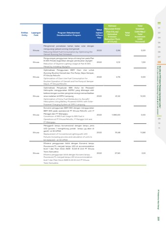 EntitasEntityLapanganFieldProgram Dekarbonisasi Decarbonization ProgramTahun InplaceInPlace YearEstimasi Penurunan Emisi (Ton CO%u2082 eq)Estimated Emission Reduction (Tons of CO%u2082eq)TotalTotalTotal Investasi (USD Ribu)Total Investment (USD Thousand)ElnusaMenghemat pemakaian bahan bakar solar dengan mengurangi jadwal running test gensetReducing Diesel Fuel Consumption by Optimizing the Genset Running Test Schedule2022 0,96 0,00ElnusaPengurangan penggunaan lampu di siang hari pada Plan B (WS Merak) digantikan dengan pembuatan skylightReduction of Daytime Lighting Usage at Plan B (WS Merak) by Installing Skylights2022 0,12 1,00ElnusaOptimalisasi Penggunaan BBM Own Use untuk Running Routine Genset dan Fire Pump, Depo Semper, PT Elnusa PetrofinOptimization of Own-Use Fuel Consumption for Routine Operation of Genset and Fire Pump at Semper Depot, PT Elnusa Petrofin2022 2,76 0,00ElnusaOptimalisasi Penyaluran BBK Avtur ke Pesawat/ Helicopter menggunakan ASPAV yang ditenagai oleh baterai dengan sumber pengisian energi memanfaatkan sinar matahari di DPPU LampungOptimization of Avtur Fuel Distribution to Aircraft/Helicopters Using Battery-Powered ASPAV with SolarPowered Charging System at DPPU Lampung2022 61,32 12,00ElnusaKonversi penggunaan BBM B30 dengan menggunakan BBM B35 pada operasional PT Elnusa Petrofin unit IT Manggis dan FT WaingapuConversion of B30 Fuel Usage to B35 Fuel in Operations at PT Elnusa Petrofin, IT Manggis Unit and FT Waingapu2022 1.080,00 0,00ElnusaMengganti lampu konvensional dengan lampu jenis LED (proses / menghitung jumlah lampu yg akan di ganti)- di SCUPNDReplacement of Conventional Lighting with LED Fixtures (including process and calculation of units to be replaced) - at SCUPND2022 91,68 10,83ElnusaEfisiensi penggunaan listrik dengan Konversi lampu Fluorescen/TL menjadi lampu LED di accommodationlevel 1 dan Main Deck AWB ELSA-8 Unit PT Elnusa Trans SamuderaEfisiensi penggunaan listrik dengan Konversi lampu Fluorescen/TL menjadi lampu LED di accommodation level 1 dan Main Deck AWB ELSA-8 Unit PT Elnusa Trans Samudera2022 27,60 2,330102030405060708 PHE's Commitment to Maintaining Sustainable Environment Komitmen PHE dalam Menjaga Lingkungan Lestari091011 PT Pertamina Hulu Energi 201
