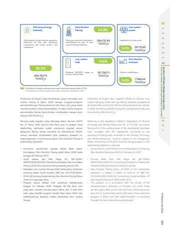 Merujuk pada regulasi yang tertuang dalam Permen ESDM No. 17 Tahun 2021 seluruh titik flare rutin di wilayah kerja Subholding Upstream sudah memenuhi regulasi sesuai pelaporan flaring setiap semester ke kementerian ESDM, namun demikian berdasarkan latar belakang dibawah ini, maka diperlukan monitoring program Zero Routine Flaring di Subholding Upstream.%u2022 Komitmen pemerintah kepada World Bank dalam Pencapaian Zero Routine Flaring pada tahun 2030 pada tanggal 20 Februari 2017.%u2022 Surat edaran dari SKK Migas No. SRT-0025/SKKMF0000/2020/S1 Perihal Pemanfaatan Gas Suar Bakar Menuju 2030 Zero Routine Flaring kepada seluruh K3S.%u2022 Kebijakan zero routine flaring 2030 Subholding Upstream tertuang dalam Surat Direktur D&P No. 015-PHE20000-2024-S0 tentang Implementasi Zero Routine Flaring Tahun 2030 di Lingkungan SHU.%u2022 Program sesuai dengan hasil workshop dekarbonisasi tanggal 3-5 Oktober 2023. Terdapat 38 titik flare rutin yang akan memiliki rencana kajian teknis dan 17 titik flarerutin yang memiliki program reduksi flare tahun 2024, dan pelaksanaannya dipantau melalui dashboard zero routine flaring.Referring to the regulations stated in Regulation of Minister of Energy and Mineral Resources No. 17 of 2021, all routine flare points in the working areas of the Subholding Upstream have complied with the regulations according to the reporting of flaring every semester to the Ministry of Energy and Mineral Resources, however, based on the background below, monitoring of the Zero Routine Flaring program in the Subholding Upstream is required.%u2022 Government%u2019s commitment to the World Bank in Achieving Zero Routine Flaring by 2030 on February 20, 2017.%u2022 Circular letter from SKK Migas No. SRT-0025/SKKMF0000/2020/S1 Concerning Utilization of Flared Gas Towards 2030 Zero Routine Flaring to all K3S.%u2022 Zero Routine Flaring policy of 2030 of the Subholding Upstream is stated in Letter of Director of D&P No. 015-PHE20000-2024-S0 concerning Implementation of Zero Routine Flaring of 2030 within SHU.%u2022 The program is in accordance with the results of the decarbonization workshop on October 3-5, 2023. There are 38 routine flare points that will have a technical study plan and 17 routine flare points that have a flare reduction program in 2024, and their implementation is monitored through the zero routine flaring dashboard.Optimization of gas turbine operation, reduction of fuel gas utilization, compressor anti surge control, LED installation664,762.14TonCO2e161,790.71TonCO2e7,084.64TonCO2e59,113.90TonCO2e294,131.49TonCO2e13.6%5.0%0.6%56.0%Kontribusi terhadap realisasi penurunan emisi perusahaan tahun 2024Contribution to the company%u2019s emission reduction realization 2024Flare gas reduction/utilization/monetization as part of zero routine flaring initiativesZero Routine FlaringLow carbon heatEfficiency Energy IntensityLow carbon powerNon-Routine emission Installation of solar panelBiodiesel B30/B35 usage as fuel for marine fleetSystem modification24.8%Production & Project juga mendukung upaya mencapai zero routine flaring di tahun 2030 dengan program-program pemanfaatan gas flaring diseluruh titik flare rutin yang masih memiliki potensi untuk dimanfaatkan. Di tahun 2024 program pemanfaatan flaring berkontribusi memberikan reduksi emisi sebesar 294 kTonCO2e.Production & Project also supports efforts to achieve zero routine flaring by 2030 with gas flaring utilization programs at all routine flare points that still have the potential to be utilized. In 2024, the flaring utilization program contributed to reducing emissions by 294 kTonCO2e.0102030405060708 PHE's Commitment to Maintaining Sustainable Environment Komitmen PHE dalam Menjaga Lingkungan Lestari091011 PT Pertamina Hulu Energi 203