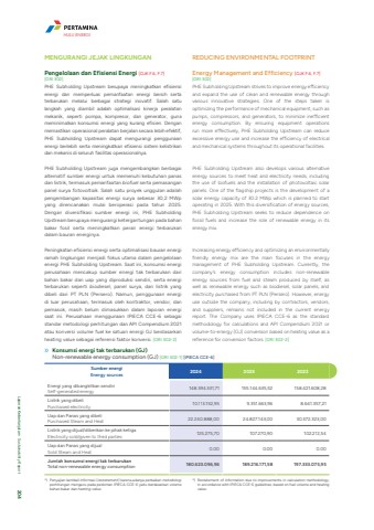MENGURANGI JEJAK LINGKUNGANPengelolaan dan Efisiensi Energi [OJK F.6, F.7][GRI 302]PHE Subholding Upstream berupaya meningkatkan efisiensi energi dan memperluas pemanfaatan energi bersih serta terbarukan melalui berbagai strategi inovatif. Salah satu langkah yang diambil adalah optimalisasi kinerja peralatan mekanik, seperti pompa, kompresor, dan generator, guna meminimalkan konsumsi energi yang kurang efisien. Dengan memastikan operasional peralatan berjalan secara lebih efektif, PHE Subholding Upstream dapat mengurangi penggunaan energi berlebih serta meningkatkan efisiensi sistem kelistrikan dan mekanis di seluruh fasilitas operasionalnya.PHE Subholding Upstream juga mengembangkan berbagai alternatif sumber energi untuk memenuhi kebutuhan panas dan listrik, termasuk pemanfaatan biofuel serta pemasangan panel surya fotovoltaik. Salah satu proyek unggulan adalah pengembangan kapasitas energi surya sebesar 30,2 MWp yang direncanakan mulai beroperasi pada tahun 2025. Dengan diversifikasi sumber energi ini, PHE Subholding Upstream berupaya mengurangi ketergantungan pada bahan bakar fosil serta meningkatkan peran energi terbarukan dalam bauran energinya.Peningkatan efisiensi energi serta optimalisasi bauran energi ramah lingkungan menjadi fokus utama dalam pengelolaan energi PHE Subholding Upstream. Saat ini, konsumsi energi perusahaan mencakup sumber energi tak terbarukan dari bahan bakar dan uap yang diproduksi sendiri, serta energi terbarukan seperti biodiesel, panel surya, dan listrik yang dibeli dari PT PLN (Persero). Namun, penggunaan energi di luar perusahaan, termasuk oleh kontraktor, vendor, dan pemasok, masih belum dimasukkan dalam laporan energi saat ini. Perusahaan menggunaan IPIECA CCE-6 sebagai standar metodologi perhitungan dan API Compendium 2021 atau konversi volume fuel ke satuan energi GJ berdasarkan heating value sebagai referensi faktor konversi. [GRI 302-2]REDUCING ENVIRONMENTAL FOOTPRINTEnergy Management and Efficiency [OJK F.6, F.7][GRI 302]PHE Subholding Upstream strives to improve energy efficiency and expand the use of clean and renewable energy through various innovative strategies. One of the steps taken is optimizing the performance of mechanical equipment, such as pumps, compressors, and generators, to minimize inefficient energy consumption. By ensuring equipment operations run more effectively, PHE Subholding Upstream can reduce excessive energy use and increase the efficiency of electrical and mechanical systems throughout its operational facilities.PHE Subholding Upstream also develops various alternative energy sources to meet heat and electricity needs, including the use of biofuels and the installation of photovoltaic solar panels. One of the flagship projects is the development of a solar energy capacity of 30.2 MWp which is planned to start operating in 2025. With this diversification of energy sources, PHE Subholding Upstream seeks to reduce dependence on fossil fuels and increase the role of renewable energy in its energy mix.Increasing energy efficiency and optimizing an environmentally friendly energy mix are the main focuses in the energy management of PHE Subholding Upstream. Currently, the company%u2019s energy consumption includes non-renewable energy sources from fuel and steam produced by itself, as well as renewable energy such as biodiesel, solar panels, and electricity purchased from PT PLN (Persero). However, energy use outside the company, including by contractors, vendors, and suppliers, remains not included in the current energy report. The Company uses IPIECA CCE-6 as the standard methodology for calculations and API Compendium 2021 or volume-to-energy (GJ) conversion based on heating value as a reference for conversion factors. [GRI 302-2]Konsumsi energi tak terbarukan (GJ) Non-renewable energy consumption (GJ) [GRI 302-1] [IPIECA CCE-6]Sumber energiEnergy sources 2024 2023 2022Energi yang dibangkitkan sendiriSelf-generated energy 148.394.331,71 155.144.635,52 158.421.608,28Listrik yang dibeliPurchased electricity 10.113.152,95 9.351.663,96 8.641.357,21Uap dan Panas yang dibeliPurchased Steam and Heat 22.240.888,00 24.827.143,00 30.372.323,00Listrik yang dijual/diberikan ke pihak ketigaElectricity sold/given to third parties 125.275,70 107.270,90 102.212,54Uap dan Panas yang dijualSold Steam and Heat 0.00 0.00 0.00Jumlah konsumsi energi tak terbarukanTotal non-renewable energy consumption 180.623.096,96 189.216.171,58 197.333.075,95*) Penyajian kembali informasi (restatement) karena adanya perbaikan metodologi perhitungan mengacu pada pedoman IPIECA CCE-6 yaitu berdasarkan volume bahan bakar dan heating value.*) Restatement of information due to improvements in calculation methodology, in accordance with IPIECA CCE-6 guidelines, based on fuel volume and heating value.HULU ENERGILaporan Keberlanjutan %u2022 Sustainability Report 204