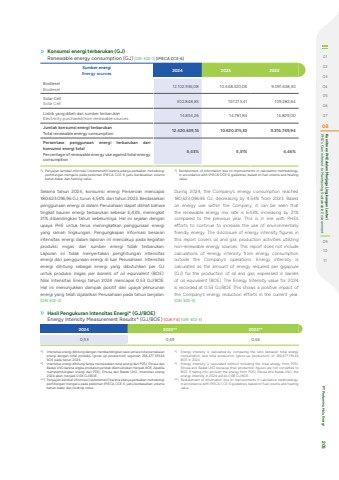 Selama tahun 2024, konsumsi energi Perseroan mencapai 180.623.096,96 GJ, turun 4,54% dari tahun 2023. Berdasarkan penggunaan energi di dalam Perusahaan dapat dilihat bahwa tingkat bauran energi terbarukan sebesar 6,43%, meningkat 21% dibandingkan tahun sebelumnya. Hal ini sejalan dengan upaya PHE untuk terus meningkatkan penggunaan energi yang ramah lingkungan. Pengungkapan informasi besaran intensitas energi dalam laporan ini mencakup pada kegiatan produksi migas dari sumber energi tidak terbarukan. Laporan ini tidak menyertakan penghitungan intensitas energi dari penggunaan energi di luar Perusahaan. Intensitas energi dihitung sebagai energi yang dibutuhkan per GJ untuk produksi migas per barrels of oil equivalent (BOE). Nilai Intensitas Energi tahun 2024 mencapai 0,53 GJ/BOE.Hal ini menunjukkan dampak positif dari upaya penurunan energi yang telah dijalankan Perusahaan pada tahun berjalan.[GRI 302-3]2024 2023** 2022** 0,53 0,49 0,54*) Intensitas energi dihitung dengan membandingkan rasio antara total pemakaian energi dengan total produksi (gross up production) sejumlah 266.477.193,46 BOE pada tahun 2024.*) Intensitas energi dihitung tanpa memasukkan total energi dari PDSI, Elnusa dan Badak LNG karena angka produksinya tidak dikonversikan menjadi BOE. Apabila memperhitungkan energi dari PDSI, Elnusa dan Badak LNG, intensitas energi 2024 akan menjadi 0,68 GJ/BOE.**) Penyajian kembali informasi (restatement) karena adanya perbaikan metodologi perhitungan mengacu pada pedoman IPIECA CCE-6 yaitu berdasarkan volume bahan bakar dan heating value.*) Energy intensity is calculated by comparing the ratio between total energy consumption and total production (gross-up production) of 266,477,193.46 BOE in 2024.*) Energy intensity is calculated without including the total energy from PDSI, Elnusa and Badak LNG because their production figures are not converted to BOE. If taking into account the energy from PDSI, Elnusa and Badak LNG, the energy intensity in 2024 will be 0.68 GJ/BOE.**) Restatement of information due to improvements in calculation methodology, in accordance with IPIECA CCE-6 guidelines, based on fuel volume and heating value.Hasil Pengukuran Intensitas Energi* (GJ/BOE) Energy Intensity Measurement Results* (GJ/BOE) [OJK F.6] [GRI 302-3]*) Penyajian kembali informasi (restatement) karena adanya perbaikan metodologi perhitungan mengacu pada pedoman IPIECA CCE-6 yaitu berdasarkan volume bahan bakar dan heating value.Konsumsi energi terbarukan (GJ) Renewable energy consumption (GJ) [GRI 302-1] [IPIECA CCE-6]Sumber energiEnergy sources 2024 2023 2022BiodieselBiodiesel 12.102.936,08 10.448.320,06 9.091.638,30Solar CellSolar Cell 302.848,83 157.213,41 109.282,64Listrik yang dibeli dari sumber terbarukanElectricity purchased from renewable sources 14.854,26 14.781,84 14.829,00Jumlah konsumsi energi terbarukanTotal renewable energy consumption 12.420.639,16 10.620.315,32 9.215.749,94Persentase penggunaan energi terbarukan dari konsumsi energi totalPercentage of renewable energy use against total energy consumption6,43% 5,31% 4,46%During 2024, the Company%u2019s energy consumption reached 180,623,096.96 GJ, decreasing by 4.54% from 2023. Based on energy use within the Company, it can be seen that the renewable energy mix rate is 6.43%, increasing by 21% compared to the previous year. This is in line with PHE%u2019s efforts to continue to increase the use of environmentally friendly energy. The disclosure of energy intensity figures in this report covers oil and gas production activities utilizing non-renewable energy sources. This report does not include calculations of energy intensity from energy consumption outside the Company%u2019s operations. Energy intensity is calculated as the amount of energy required per gigajoule (GJ) for the production of oil and gas, expressed in barrels of oil equivalent (BOE). The Energy Intensity value for 2024 is recorded at 0.53 GJ/BOE This shows a positive impact of the Company%u2019s energy reduction efforts in the current year. [GRI 302-3]*) Restatement of information due to improvements in calculation methodology, in accordance with IPIECA CCE-6 guidelines, based on fuel volume and heating value.0102030405060708 PHE's Commitment to Maintaining Sustainable Environment Komitmen PHE dalam Menjaga Lingkungan Lestari091011 PT Pertamina Hulu Energi 205