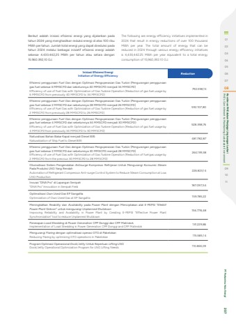 Inisiasi Efisiensi EnergiInitiation of Energy Efficiency ReductionEfisiensi penggunaan Fuel Gas dengan Optimasi Pengoperasian Gas Turbin (Pengurangan penggunaan gas fuel sebesar 6 MMSCFD dari sebelumnya 40 MMSCFD menjadi 34 MMSCFD)Efficiency of use of Fuel Gas with Optimization of Gas Turbine Operation (Reduction of gas fuel usage by 6 MMSCFD from previously 40 MMSCFD to 34 MMSCFD)792.598,13Efisiensi penggunaan Fuel Gas dengan Optimasi Pengoperasian Gas Turbin (Pengurangan penggunaan gas fuel sebesar 2 MMSCFD dari sebelumnya 28 MMSCFD menjadi 26 MMSCFD)Efficiency of use of Fuel Gas with Optimization of Gas Turbine Operation (Reduction of gas fuel usage by 2 MMSCFD from previously 28 MMSCFD to 26 MMSCFD)592.107,80Efisiensi penggunaan Fuel Gas dengan Optimasi Pengoperasian Gas Turbin (Pengurangan penggunaan gas fuel sebesar 4 MMSCFD dari sebelumnya 34 MMSCFD menjadi 30 MMSCFD)Efficiency of use of Fuel Gas with Optimization of Gas Turbine Operation (Reduction of gas fuel usage by 4 MMSCFD from previously 34 MMSCFD to 30 MMSCFD)528.398,76Naturalisasi Bahan Bakar Kapal menjadi Diesel B35Naturalization of Ship Fuel to Diesel B35 481.782,87Efisiensi penggunaan Fuel Gas dengan Optimasi Pengoperasian Gas Turbin (Pengurangan penggunaan gas fuel sebesar 2 MMSCFD dari sebelumnya 30 MMSCFD menjadi 28 MMSCFD)Efficiency of use of Fuel Gas with Optimization of Gas Turbine Operation (Reduction of fuel gas usage by 2 MMSCFD from the previous 30 MMSCFD to 28 MMSCFD)264.199,38Otomatisasi Sistem Pengendalian Antisurge Kompresor Refrijeran Untuk Mengurangi Konsumsi Steam Pada Produksi LNG Yang RendahAutomation of Refrigerant Compressor Anti-surge Control System to Reduce Steam Consumption at Low LNG Production226.823,14Inovasi %u201cDNA Pro%u201d di Lapangan Senipah%u201cDNA Pro%u201d Innovation in Senipah Field 187.097,54Optimalisasi Own Used Gas EP SangattaOptimization of Own Used Gas at EP Sangatta 159.785,22Meningkatkan Reability dan Availability pada Power Plant dengan Menciptakan alat E-PEPSI %u201cEfektif Power Plant Sinkron%u201d untuk mengurangi Unplanned ShutdownImproving Reliability and Availability in Power Plant by Creating E-PEPSI %u201cEffective Power Plant Synchronization%u201d tool to reduce Unplanned Shutdown156.778,48Penerapan Load Shedding di Power Generation CPP Donggi dan CPP MatindokImplementation of Load Shedding in Power Generation CPP Donggi and CPP Matindok 131.229,86Mengurangi Flaring dengan optimalisasi operasi GTG di PabelokanReducing Flaring by optimizing GTG operations in Pabelokan 115.585,14Program Optimasi Operasional Dock/Jetty Untuk Keperluan Lifting LNGDock/Jetty Operational Optimization Program for LNG Lifting Needs 110.865,09Berikut adalah inisiasi efisiensi energi yang dijalankan pada tahun 2024 yang menghasilkan reduksi energi di atas 100 ribu MWh per tahun. Jumlah total energi yang dapat direduksi pada tahun 2024 melalui berbagai inisiatif efisiensi energi adalah sebesar 4.433.442,25 MWh per tahun atau setara dengan 15.960.392,10 GJ.The following are energy efficiency initiatives implemented in 2024 that result in energy reductions of over 100 thousand MWh per year. The total amount of energy that can be reduced in 2024 through various energy efficiency initiatives is 4,433,442.25 MWh per year equivalent to a total energy consumption of 15,960,392.10 GJ.0102030405060708 PHE's Commitment to Maintaining Sustainable Environment Komitmen PHE dalam Menjaga Lingkungan Lestari091011 PT Pertamina Hulu Energi 207