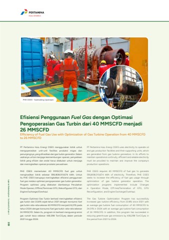 PT Pertamina Hulu Energi OSES menggunakan listrik untuk mengoperasikan unit-unit fasilitas produksi migas dan penunjangnya, yang dihasilkan dari gas turbin generator. Dalam usahanya untuk menjaga kesinambungan operasi, penyediaan listrik yang efisien dan andal harus dilakukan untuk menjaga dan meningkatkan operasi produksi perusahaan.PHE OSES memerlukan 40 MMSCFD fuel gas untuk menghasilkan listrik sebesar 596.808.013.674 kWh. Untuk itu PHE OSES berupaya meningkatkan efisiensi penggunaan fuel gas melalui optimasi pengoperasian gas turbin generator. Program optimasi yang dilakukan diantaranya Perubahan Mode Operasi, Offhire/Terminasi GTG, Rekonfigurasi GTG, dan Engine Exchange/Overhaul.Program Optimasi Gas Turbin berhasil meningkatkan efisiensi gas turbin dari 22,8% sejak tahun 2021 dengan konsumsi fuel gas turbin rata-rata sebesar 40 MMSCFD menjadi 24,01% pada tahun 2024 dengan konsumsi fuel gas turbin rata-rata sebesar 24 MMSCFD. Selain itu, program ini berhasil mengurangi emisi gas rumah kaca sebesar 436.298 TonCO%u2082eq dalam periode 2021 hingga 2024.PT Pertamina Hulu Energi OSES uses electricity to operate oil and gas production facilities and their supporting units, which are generated from gas turbine generators. In its efforts to maintain operational continuity, efficient and reliable electricity must be provided to maintain and improve the company%u2019s production operations.PHE OSES requires 40 MMSCFD of fuel gas to generate 596,808,013,674 kWh of electricity. Therefore, PHE OSES seeks to increase the efficiency of fuel gas usage through optimization of gas turbine generator operation. The optimization programs implemented include Changes in Operation Mode, Off-hire/Termination of GTG, GTG Reconfiguration, and Engine Exchange/Overhaul.The Gas Turbine Optimization Program has successfully increased gas turbine efficiency from 22.8% since 2021 with an average gas turbine fuel consumption of 40 MMSCFD to 24.01% in 2024 with an average gas turbine fuel consumption of 24 MMSCFD. In addition, this program has succeeded in reducing greenhouse gas emissions by 436,298 TonCO%u2082eq in the period from 2021 to 2024.Efisiensi Penggunaan Fuel Gas dengan Optimasi Pengoperasian Gas Turbin dari 40 MMSCFD menjadi 26 MMSCFDEfficiency of Fuel Gas Use with Optimization of Gas Turbine Operation from 40 MMSCFD to 26 MMSCFDPHE OSES - Subholding UpstreamHULU ENERGILaporan Keberlanjutan %u2022 Sustainability Report 208