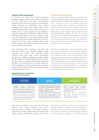 Offshore Well-ManagementPT Pertamina Hulu Energi (PHE) Subholding Upstream menjalankan kegiatan eksplorasi dan produksi minyak serta gas baik di darat maupun lepas pantai, yang berpotensi mempengaruhi ekosistem laut di sekitarnya. Untuk mengurangi dampak lingkungan dan meminimalkan jejak ekologis, pengelolaan sumur lepas pantai dilakukan dengan sistem yang ketat sejak tahap perencanaan hingga penutupan sumur. Seluruh proses ini, yang mencakup fase pra-operasional, operasional, hingga pasca-operasional, mengikuti Pedoman Pengelolaan Well Integrity yang telah diberlakukan sejak Januari 2021. Pengelolaan sumur lepas pantai berada di bawah koordinasi Fungsi Produksi, sebagai pemilik aset, serta Fungsi Drilling Well Intervention, yang memastikan bahwa setiap aktivitas dilakukan sesuai standar tertinggi guna mengurangi potensi risiko terhadap lingkungan.Selain menerapkan sistem manajemen yang ketat, PHE Subholding Upstream juga mengadopsi berbagai langkah pengawasan dan evaluasi untuk memastikan bahwa operasional lepas pantai tidak merusak keseimbangan ekosistem laut. Langkah ini mencakup pemantauan berkala terhadap kualitas air serta keberlanjutan biota laut di sekitar area operasi. Selain itu, penerapan teknologi ramah lingkungan digunakan untuk mengurangi emisi dan limbah operasional. Melalui pendekatan ini, PHE berkomitmen untuk menjalankan operasional yang efisien dan berkelanjutan, sekaligus menjaga kelestarian lingkungan maritim.Pengelolaan Sumur Lepas PantaiOffshore Well ManagementPraoperasionalPre-operationalOperasionalOperationalPascaoperasionalPost-operationalMemastikan semua sumur yang akan dikerjakan mengikuti prinsip-prinsip pemboran dan well integrity yang baik, mengacu pada Pedoman Pemboran dan Pedoman Pengelolaan Well Integrity.Ensure that all wells to be operated based on the good drilling and integrity principles refers to Drilling Guideline Well Integrity Management Guidelines.Melakukan monitoring dan perawatan umum oleh tim Produksi dan tim Well Integrity, mengacu pada Pedoman Pengelolaan Well Integrity.General monitoring and maintenance are carried out by the production team and well integrity team referring to the Well Integrity Management Guidelines.Dilakukan monitoring oleh tim Produksi/Aset, mengacu pada Pedoman Pengelolaan Well Integrity dan Pedoman Kerja Pascaoperasi.Monitoring by the Production/ Asset team refers to Well Integrity Management Guidelines and Post Operation Work Guidelines.Sesuai dengan visi Pertamina Hulu Energi (PHE) Subholding Upstream untuk %u201cMenjadi Perusahaan Kelas Dunia%u201d, maka penting bagi perusahaan untuk dapat memastikan pengelolaan sumur baik di wilayah darat maupun lepas pantai dilakukan dengan sebaik-baiknya dengan mengacu pada Offshore Well ManagementPT Pertamina Hulu Energi (PHE) Subholding Upstream performs oil and gas exploration and production activities both onshore and offshore, which have the potential to affect the surrounding marine ecosystem. To reduce environmental impacts and minimize ecological footprints, offshore well management is conducted with a strict system from the planning stage to well closure. This entire process, which includes pre-operational, operational, and post-operational phases, follows the Well Integrity Management Guidelines that have been in effect since January 2021. Offshore well management is under the coordination of the Production Function, as the asset owner, and the Drilling Well Intervention Function, which ensures that every activity is conducted to the highest standards to reduce potential risks to the environment.In addition to implementing a strict management system, PHE Subholding Upstream also adopts various monitoring and evaluation measures to ensure that offshore operations do not damage the balance of the marine ecosystem. These measures include regular monitoring of water quality and the sustainability of marine biota around the areas of operation. In addition, the application of environmentally friendly technology is used to reduce operational emissions and waste. Through this approach, PHE Subholding Upstream is committed to running efficient and sustainable operations, while maintaining the sustainability of marine environment.In accordance with the vision of Pertamina Hulu Energi (PHE) Subholding Upstream to %u201cBecome a World Class Company%u201d, it is important for the company to ensure that well management both onshore and offshore is conducted properly by referring to various applicable regulations. If not managed properly, 0102030405060708 PHE's Commitment to Maintaining Sustainable Environment Komitmen PHE dalam Menjaga Lingkungan Lestari091011 PT Pertamina Hulu Energi 209