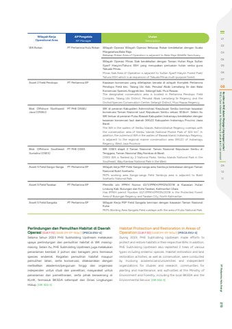 Wilayah KerjaOperational AreaAP PengelolaAP ManagerUraianDescriptionWK Rokan PT Pertamina Hulu Rokan Wilayah Operasi Wilayah Operasi Bekasap Rokan berdekatan dengan Suaka Margasatwa Balai Raja.Bekasap Rokan Area of Operation is adjacent to Balai Raja Wildlife Sanctuary.Wilayah Operasi Minas Siak berdekatan dengan Taman Hutan Raya Sultan Syarif Hasyim/Tahura SSH yang merupakan perluasan hutan serba guna Takuala Minas.Minas Siak Area of Operation is adjacent to Sultan Syarif Hasyim Forest Park/Tahura SSH which is an expansion of Takuala Minas multi-purpose forest.Asset 2 Field Pendopo PT Pertamina EP Kawasan konservasi yang ditetapkan berada di wilayah Komplek Pertamina Pendopo Field kec. Talang Ubi Kab. Penukal Abab Lematang Ilir dan Balai Konservasi Spesies Anggrek kec. Selangit kab. Musi Rawas.The designated conservation area is located in Pertamina Pendopo Field Complex, Talang Ubi District, Penukal Abab Lematang Ilir Regency and the Orchid Species Conservation Center, Selangit District, Musi Rawas Regency.Blok Offshore Northwest Java (ONWJ)PT PHE ONWJ WK di perairan Kabupaten Administrasi Kepulauan Seribu beririsan kawasan konservasi Taman Nasional Laut Kepulauan Seribu seluas 324km2. Selain itu WK terluar di perairan Pulau Biawak Kabupaten Indramayu berdekatan dengan kawasan konservasi laut daerah (KKLD) Kabupaten Indramayu Provinsi Jawa Barat.The WA in the waters of Seribu Islands Administrative Regency overlaps with the conservation area of Seribu Islands National Marine Park of 324 km2. In addition, the outermost WA in the waters of Biawak Island, Indramayu Regency, is adjacent to the regional marine conservation area (KKLD) of Indramayu Regency, West Java Province.Blok Offshore Southeast Sumatra (OSES)PT PHE OSES WK OSES diapit 2 Taman Nasional: Taman Nasional Kepulauan Seribu di Tenggara, Taman Nasional Way Kambas di Barat.OSES WA is flanked by 2 National Parks: Seribu Islands National Park in the Southeast, Way Kambas National Park in the West.Asset 5 Field Sanga-Sanga PT Pertamina EP Wilayah kerja PEP Field Sanga-sanga area Samboja berbatasan dengan Taman Nasional Bukit Soeharto.PEP%u2019s working area Sanga-sanga Field Samboja area is adjacent to Bukit Soeharto National Park.Asset 5 Field Tarakan PT Pertamina EP Memiliki izin IPPKH Nomor 42/1/IPPKH/PMDN/2018 di Kawasan Hutan Lindung Kab. Bulungan dan Kota Tarakan, Kalimantan Utara.Has IPPKH permit Number 42/1/IPPKH/PMDN/2018 in the Protected Forest Area of Bulungan Regency and Tarakan City, North Kalimantan.Asset 5 Field Sangata PT Pertamina EP Wilayah Kerja PEP Field Sangata beririsan dengan kawasan Taman Nasional Kutai.PEP%u2019s Working Area Sangata Field overlaps with the area of Kutai National Park. Perlindungan dan Pemulihan Habitat di Daerah Operasi [OJK F.10] [SASB EM-EP-160a.1] [IPIECA ENV-4]Selama tahun 2023 PHE Subholding Upstream melakukan upaya perlindungan dan pemulihan habitat di WK masingmasing. Selain itu, PHE Subholding Upstream juga melakukan penanaman kembali 2 pohon dari beragam jenis termasuk spesies endemik. Kegiatan pemulihan habitat maupun pemulihan lahan, serta konservasi, dilaksanakan dengan melibatkan akademisi/perguruan tinggi dan organisasi independen untuk studi dan penelitian, masyarakat untuk penanaman dan pemeliharaan, serta pihak berwenang di KLHK, termasuk BKSDA setempat dan Dinas Lingkungan Hidup. [GRI 304-3] Habitat Protection and Restoration in Areas of Operation [OJK F.10] [SASB EM-EP-160a.1] [IPIECA ENV-4]During 2023, PHE Subholding Upstream made efforts to protect and restore habitats in their respective WAs. In addition, PHE Subholding Upstream also replanted 2 trees of various types including endemic species. Habitat restoration and land restoration activities, as well as conservation, were conducted by involving academicians/universities and independent organizations for studies and research, communities for planting and maintenance, and authorities at the Ministry of Environment and Forestry, including the local BKSDA and the Environmental Service. [GRI 304-3] 0102030405060708 PHE's Commitment to Maintaining Sustainable Environment Komitmen PHE dalam Menjaga Lingkungan Lestari091011 PT Pertamina Hulu Energi 213