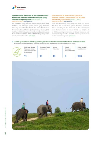 Spesies Daftar Merah IUCN dan Spesies Daftar Konservasi Nasional Habitat di Wilayah yang Terkena Dampak Operasi [GRI 304-1, 304-4][SASB EM-EP-160a.3] [IPIECA ENV-4]Dari identifikasi yang dilakukan sampai dengan tahun 2023, diketahui ada beberapa spesies fauna yang berstatus dilindungi menurut Daftar Merah The International Union for Conservation of Nature (IUCN); Undang-Undang (UU) No. 5 Tahun 1990 tentang Konservasi Sumber Daya Alam; serta Peraturan Pemerintah No. 7 Tahun 1999 tentang Pengawetan Jenis Tumbuhan dan Satwa. [GRI 304-1]Species in IUCN Red List and Species in National Habitat Conservation List in Areas Affected by Operations [GRI 304-1, 304-4][SASB EM-EP-160a.3] [IPIECA ENV-4]From the identification conducted until 2023, it is known that there are several fauna species that have protected status according to the Red List of The International Union for Conservation of Nature (IUCN); Law (UU) No. 5 of 1990 concerning Conservation of Natural Resources; and Government Regulation No. 7 of 1999 concerning Preservation of Plant and Animal Species. [GRI 304-1]Kritis atau Sangat Terancam PunahCritical or Critically EndangeredTerancam PunahEndangeredRentanVulnerableHampir TerancamNear Threatened Risiko Rendah Least Concern 11 19 18 9 163Jumlah Spesies Fauna Dilindungi dan Tingkat Kepunahan Berdasarkan Daftar Merah IUCN Tahun 2024 Number of Protected Fauna Species and Extinction Rate Based on IUCN Red List of 2024HULU ENERGILaporan Keberlanjutan %u2022 Sustainability Report 214