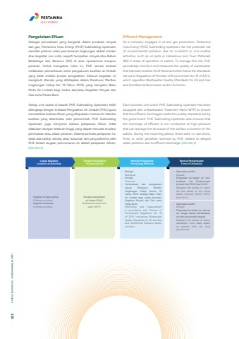 %u2022 Digunakan sendiri.Reused.%u2022 Dilepaskan ke badan air: laut, berdasar Izin Pembuangan Limbah Cair (IPLC) dari KLHK.Released into bodies of water: the sea, based on the Liquid Waste Disposal Permit (IPLC) from KLHK.%u2022 Digunakan sendiriReused%u2022 Dilepaskan ke badan air: saluran air, sungai, danau, berdasarkan izin dari pemerintah daerah.Released into bodies of water: waterways, rivers, lakes, based on permits from the local government.Bentuk PemanfaatanForm of Utilization%u2022 Biologis.Biological.%u2022 Kimiawi.Chemical.%u2022 Pemantauan dan pengukuran sesuai Peraturan Menteri Lingkungan Hidup Nomor 19 Tahun 2010 tentang Baku Mutu Air Limbah bagi Usaha dan/atau Kegiatan Minyak dan Gas serta Panas Bumi.Monitoring and measurement in accordance with Minister of Environment Regulation No. 19 of 2010 concerning Wastewater Quality Standards for Oil and Gas and Geothermal Business and/or Activities.Metode PengolahanProcessing MethodsInstalasi pengolahan air limbah (IPAL)Wastewater treatment plant (WTP) Tempat PengolahanProcessing Site%u2022 Kegiatan di lepas pantai Offshore activities%u2022 Kegiatan di daratanOnshore activitiesLokasi KegiatanLocation of ActivitiesPengelolaan EfluenSebagai perusahaan yang bergerak dalam produksi minyak dan gas, Pertamina Hulu Energi (PHE) Subholding Upstream memiliki potensi risiko pencemaran lingkungan akibat insiden atau kegiatan non-rutin, seperti tumpahan minyak atau Bahan Berbahaya dan Beracun (B3) di area operasional maupun perairan. Untuk mengelola risiko ini, PHE secara berkala melakukan pemantauan serta pengukuran kualitas air limbah yang telah melalui proses pengolahan. Seluruh kegiatan ini mengikuti standar yang ditetapkan dalam Peraturan Menteri Lingkungan Hidup No. 19 Tahun 2010, yang mengatur Baku Mutu Air Limbah bagi Usaha dan/atau Kegiatan Minyak dan Gas serta Panas Bumi.Setiap unit usaha di bawah PHE Subholding Upstream telah dilengkapi dengan Instalasi Pengolahan Air Limbah (IPAL) guna memastikan bahwa efluen yang dilepaskan memenuhi standar kualitas yang ditentukan oleh pemerintah. PHE Subholding Upstream juga menjamin bahwa pelepasan efluen tidak dilakukan dengan tekanan tinggi yang dapat merusak struktur permukaan atau dasar perairan. Selama periode pelaporan ini, tidak ada sanksi, denda, atau hukuman lain yang diterima oleh PHE terkait dugaan pencemaran air akibat pelepasan efluen. [GRI 303-2]Effluent ManagementAs a company engaged in oil and gas production, Pertamina Hulu Energi (PHE) Subholding Upstream has the potential risk of environmental pollution due to incidents or non-routine activities, such as oil spills or Hazardous and Toxic Materials (B3) in areas of operation or waters. To manage this risk, PHE periodically monitors and measures the quality of wastewater that has been treated. All of these activities follow the standards set out in Regulation of Minister of Environment No. 19 of 2010, which regulates Wastewater Quality Standards for Oil and Gas and Geothermal Businesses and/or Activities.Each business unit under PHE Subholding Upstream has been equipped with a Wastewater Treatment Plant (WTP) to ensure that the effluent discharged meets the quality standards set by the government. PHE Subholding Upstream also ensures that the discharge of effluent is not conducted at high pressure that can damage the structure of the surface or bottom of the waters. During this reporting period, there were no sanctions, fines, or other penalties received by PHE related to alleged water pollution due to effluent discharge. [GRI 303-2]HULU ENERGILaporan Keberlanjutan %u2022 Sustainability Report 220
