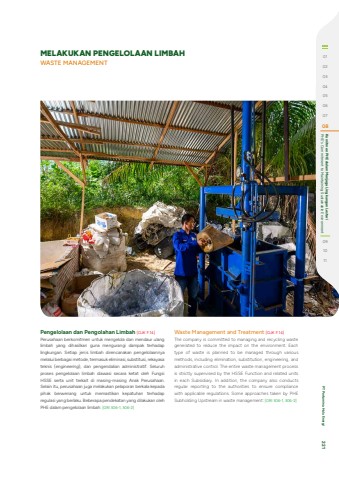 Pengelolaan dan Pengolahan Limbah [OJK F.14]Perusahaan berkomitmen untuk mengelola dan mendaur ulang limbah yang dihasilkan guna mengurangi dampak terhadap lingkungan. Setiap jenis limbah direncanakan pengelolaannya melalui berbagai metode, termasuk eliminasi, substitusi, rekayasa teknis (engineering), dan pengendalian administratif. Seluruh proses pengelolaan limbah diawasi secara ketat oleh Fungsi HSSE serta unit terkait di masing-masing Anak Perusahaan. Selain itu, perusahaan juga melakukan pelaporan berkala kepada pihak berwenang untuk memastikan kepatuhan terhadap regulasi yang berlaku. Beberapa pendekatan yang dilakukan oleh PHE dalam pengelolaan limbah: [GRI 306-1, 306-2]Waste Management and Treatment [OJK F.14]The company is committed to managing and recycling waste generated to reduce the impact on the environment. Each type of waste is planned to be managed through various methods, including elimination, substitution, engineering, and administrative control. The entire waste management process is strictly supervised by the HSSE Function and related units in each Subsidiary. In addition, the company also conducts regular reporting to the authorities to ensure compliance with applicable regulations. Some approaches taken by PHE Subholding Upstream in waste management: [GRI 306-1, 306-2]MELAKUKAN PENGELOLAAN LIMBAHWASTE MANAGEMENT 0102030405060708 PHE's Commitment to Maintaining Sustainable Environment Komitmen PHE dalam Menjaga Lingkungan Lestari091011 PT Pertamina Hulu Energi 221