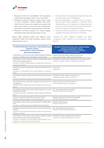 10 Inisiatif Teratas dalam Pengurangan Limbah Berbahaya yang Dihasilkan / DibuangTop 10 Initiatives in Reducing Hazardous Waste Generated/Disposed10 Inisiatif Teratas dalam Pengurangan Limbah Non-Bahan Berbahaya yang Dihasilkan / DibuangTop 10 Initiatives in Reducing Non-Hazardous Waste Generated/DisposedPemanfaatan Limbah Drilling Cutting SOBM Sebagai Raw MaterialUtilization of SOBM Drilling Cutting Waste as Raw MaterialsComposting Limbah Organik Dedaunan dan Rumput Composting of Organic Waste of Leaves and GrassPemanfaatan Limbah Serbuk Bor B330-2 Menjadi Bahan Baku Semen oleh Pihak Ketiga BerizinUtilization of B330-2 Drilling Waste as Cement Raw Materials by Licensed Third PartiesPemanfaatan sampah organik sebagai kompos dan pakan ternak Utilization of organic waste as compost and animal feedPemanfaatan Tanah Terkontaminasi sebagai Bahan Baku Semen & Batu BataUtilization of Contaminated Soil as Raw Materials for Cement & BricksCompostingCompostingPemanfaatan Limbah B3 sebagai Alternatif Raw Material oleh pihak ke-3Utilization of B3 Waste as Alternative Raw Materials by third PartiesPemanfaatan Limbah Organik menjadi komposUtilization of Organic Waste into CompostPemanfaatan Limbah sludge IPAL sebagai bahan baku batu bata oleh pihak ke-3Utilization of IPAL sludge waste as raw materials for bricks by third partiesProgram 3R limbah non B3 oleh pihak ke-33R non-B3 waste program by 3rd partiesPemanfaatan Limbah Residu Dasar Tangki Minyak Bumi menjadi Bahan Bakar AlternatifUtilization of Petroleum Tank Bottom Residue Waste as Alternative FuelDaur ulang sampah Plastik dan KalengRecycling of Plastic and Can WasteProgram Pemanfaatan Limbah B3 oleh pihak ke-3 berizinB3 Waste Utilization Program by licensed third partiesPengolahan Sampah Domestik oleh pihak ketigaDomestic Waste Treatment by Third PartiesPemanfaatan Limbah Serbuk Bor Oil Base (B330-2) sebagai Bahan BakuUtilization of Oil Base Drilling Waste (B330-2) as Raw MaterialsSedekah Sampah Zona 10Garbage Charity Zone 10Upgrading Fasilitas Pemisahan Air Proses di Luar Fasilitas Eksisting ProduksiUpgrade of Processed Water Separation Facilities Outside Existing Production FacilitiesDaur ulang sampah kertas dan kardusRecycling of paper and cardboard wastePemanfaatan Limbah Residu Proses Produksi (A330-2) sebagai bahan baku bata merah oleh pihak ketiga berizinUtilization of Production Process Residue Waste (A330-2) as raw materials for red bricks by licensed third partiesPemanfaatan Limbah Anorganik (Reuse, Recycle)Utilization of Inorganic Waste (Reuse, Recycle)1. Reducing waste and increasing waste treatment ratio with the reduce, reuse, recycle (3R) approach2. B3 waste management is conducted with the cradle to grave principle. Waste treatment is conducted either independently by a unit of operation or in collaboration with a third party that has a permit that includes transportation, utilization, treatment, and storage of B3 waste.3. Conducting monitoring, reporting and evaluation of waste management activities, both B3 and non-B3 waste.Following are some initiatives undertaken for waste management, both hazardous and non-hazardous waste: [OJK F.5]1. Mengurangi limbah dan meningkatkan rasio pengolahan limbah dengan pendekatan reduce, reuse, recycle (3R).2. Pengelolaan limbah B3 dilakukan dengan prinsip cradle to grave. Pengolahan Limbah dilakukan baik secara mandiri oleh unit operasi atau bekerja sama dengan pihak ketiga yang memiliki izin yang mencakup pengangkutan, pemanfaatan, pengolahan, hingga penimbunan limbah B3.3. Melakukan monitoring, pelaporan, dan evaluasi kegiatan pengelolaan limbah baik limbah B3 maupun non-B3.Berikut adalah beberapa inisiatif yang dilakukan untuk pengelolaan limbah baik limbah berbahaya maupun limbah tidak berbahaya: [OJK F.5]HULU ENERGILaporan Keberlanjutan %u2022 Sustainability Report 222