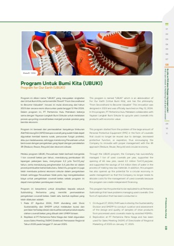 Program ini diberi nama %u201cUBUKI%u201d yang merupakan singkatan dari Untuk Bumi Kita, serta memiliki filosofi %u201cFrom Secondhand to Become Valuable%u201d. Inovasi ini mulai dirancang dari tahun 2023 dan secara resmi diluncurkan pada tanggal 12 Mei 2024. Dalam program ini, PT Pertamina Hulu Mahakam bekerja sama dengan Yayasan Langkah Bumi Sirkular untuk melalukan proses upcycling coverall bekas menjadi produk-produk yang bernilai ekonomi.Program ini berawal dari permasalahan banyaknya timbunan Alat Pelindung Diri (APD) berupa coverall yang sudah tidak dapat digunakan kembali karena rusak, penurunan fungsi proteksi, atau pun kedaluwarsa, sehingga mendorong Perusahaan untuk berinovasi dengan pengelolaan yang tepat dengan pendekatan 3R (Reduce, Reuse, Recycle) dan ekonomi sirkular.Melalui program UBUKI, Perusahaan telah berhasil mengelola 1 ton coverall bekas per tahun, mendukung pembukaan 65 lapangan pekerjaan baru, menyimpan 2,2 juta TonCO2eq/tahun, serta mendukung penghematan 3,4 juta liter air dalam proses pembuatan bahan baku baru. Selain itu, program ini juga telah membuka potensi ekonomi sirkular dalam pengelolaan limbah sehingga Perusahaan tidak perlu lagi mengalokasikan biaya untuk pengelolaan coverall bekas sebab program ini dapat menciptakan pembiayaan mandiri.Program ini berpotensi untuk direplikasi kepada seluruh Subholding Pertamina yang memiliki permasalahan pengelolaan coverall bekas. Salah satu bentuk replikasi yang telah dilakukan adalah:1. Pada 27 Agustus 2024, PHM diundang oleh Divisi Sustainability dan SMEPP untuk melakukan kurasi dan penilaian terhadap desain dan kualitas sampel produk sepatu olahan coverall bekas yang dibuat oleh UMKM binaan.2. Replikasi di PT Pertamina Patra Niaga dan telah digunakan acara Sales Meeting (NSM) Direktorat Pemasaran Regional Tahun 2025 pada tanggal 17 Januari 2025.This program is named %u201cUBUKI%u201d which is an abbreviation of For Our Earth (Untuk Bumi Kita), and has the philosophy %u201cFrom Secondhand to Become Valuable%u201d. This innovation was designed in 2023 and was officially launched on May 12, 2024. In this program, PT Pertamina Hulu Mahakam collaborates with Yayasan Langkah Bumi Sirkular to upcycle used coveralls into products with economic value.This program started from the problem of the large amount of Personal Protective Equipment (PPE) in the form of coveralls that could no longer be reused due to damage, decreased protective function, or expiration, thus encouraging the Company to innovate with proper management with the 3R approach (Reduce, Reuse, Recycle) and circular economy.Through the UBUKI program, the Company has successfully managed 1 ton of used coveralls per year, supported the opening of 65 new jobs, saved 2.2 million TonCO2eq/year, and supported the savings of 3.4 million liters of water in the process of making new raw materials. In addition, this program has also opened up the potential for a circular economy in waste management so that the Company no longer needs to allocate costs for the management of used coveralls because this program can create independent financing.This program has the potential to be replicated to all Pertamina Subholdings that have problems managing used coveralls. One form of replication that has been conducted is:1. On August 27, 2024, PHM was invited by the Sustainability Division and SMEPP to conduct curation and assessment of the design and quality of samples of shoe products from processed used coveralls made by assisted MSMEs.2. Replication at PT Pertamina Patra Niaga and has been used for Sales Meeting (NSM) of Directorate of Regional Marketing of 2025 on January 17, 2025.Program Untuk Bumi Kita (UBUKI)Program for Our Earth (UBUKI)Zona 8 - SHU0102030405060708 PHE's Commitment to Maintaining Sustainable Environment Komitmen PHE dalam Menjaga Lingkungan Lestari091011 PT Pertamina Hulu Energi 223