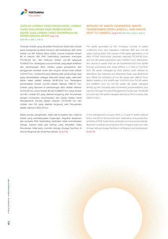 JUMLAH LIMBAH YANG DIHASILKAN, LIMBAH YANG DIALIHKAN DARI PEMBUANGAN AKHIR, DAN LIMBAH YANG DIKIRIMKAN KE PEMBUANGAN AKHIR [OJK F.13][GRI 306-3, 306-4, 306-5]Timbulan limbah yang dihasilkan Perseroan terdiri dari limbah yang mengandung bahan beracun dan berbahaya (B3) serta limbah non-B3. Selama tahun 2024, volume timbulan limbah B3 di seluruh WK PHE Subholding Upstream mencapai 175.144,45 ton, dan timbulan limbah non-B3 sebanyak 15.569,27 ton. Sedangkan volume limbah yang dapat dialihkan dari pembuangan akhir melalui upaya pengolahan dan penggunaan kembali reuse dan recycle secara total adalah 4.374,47 ton. Limbah B3 yang dikelola oleh pihak ketiga, baik yang dimanfaatkan sebagai alternatif bahan baku, alternatif bahan bakar adalah sebesar 84.874,44 ton. Sedangkan pemanfaatan limbah non-B3 adalah sebesar 1.981,47 ton. Limbah yang diproses di pembuangan akhir adalah sebesar 15.415,00 ton untuk limbah B3 dan 6.288,67 ton untuk limbah non-B3. Limbah B3 yang dikelola langsung oleh Perusahaan dengan incinerator, bioremediasi, dan injeksi melalui Sand Management Facility adalah sebesar 74.535,83 ton dan Limbah Non B3 yang dikelola langsung oleh Perusahaan adalah sebesar 2.600,14 ton.Dalam proses pengelolaan, tidak ada tumpahan dari material limbah yang membahayakan lingkungan. Kegiatan eksplorasi dan produksi PHE Subholding Upstream tidak menimbulkan tailings. Karena tidak ada tailings yang dihasilkan maka Perusahaan tidak perlu memiliki tailings storage facilities di seluruh Regional dan Anak Perusahaan. [OJK F.15]AMOUNT OF WASTE GENERATED, WASTE TRANSFERRED FROM LANDFILL, AND WASTE SENT TO LANDFILL [OJK F.13] [GRI 306-3, 306-4, 306-5]The waste generated by the Company consists of waste containing toxic and hazardous materials (B3) and non-B3 waste. During 2024, the volume of B3 waste generation in all WAs of PHE Subholding Upstream reached 175,144.45 tons, and non-B3 waste generation was 15,569.27 tons. Meanwhile, the volume of waste that can be transferred from the landfill through processing and reuse efforts is a total of 4,374.47 tons. B3 waste managed by third parties, both utilized as alternative raw materials and alternative fuels, was 84,874.44 tons. While the utilization of non-B3 waste was 1,981.47 tons. Waste treated in the landfill was 15,415.00 tons for B3 waste and 6,288.67 tons for non-B3 waste. B3 waste managed directly by the Company with incinerators, bioremediation, and injection through the Sand Management Facility was 74,535.83 tons and Non-B3 waste managed directly by the Company was 2,600.14 tons.In the management process, there is no spill of waste material that is harmful to the environment. Exploration and production activities of PHE Subholding Upstream do not produce tailings. Because no tailings are produced, the Company does not need to have tailings storage facilities in all Regions and Subsidiaries. [OJK F.15]HULU ENERGILaporan Keberlanjutan %u2022 Sustainability Report 224