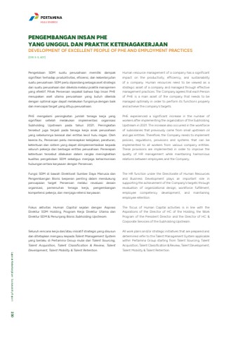 Pengelolaan SDM suatu perusahaan memiliki dampak signifikan terhadap produktivitas, efisiensi, dan keberlanjutan suatu perusahaan. SDM perlu dipandang sebagai aset strategis dari suatu perusahaan dan dikelola melalui praktik manajemen yang efektif. Pihak Perseroan sepakat bahwa tiap Insan PHE merupakan aset utama perusahaan yang butuh dikelola dengan optimal agar dapat melakukan fungsinya dengan baik dan mencapai target yang dituju perusahaan.PHE mengalami peningkatan jumlah tenaga kerja yang signifikan setelah melakukan implementasi organisasi Subholding Upstream pada tahun 2021. Peningkatan tersebut juga terjadi pada tenaga kerja anak perusahaan yang sebelumnya berasal dari entitas kecil hulu migas. Oleh karena itu, Perseroan perlu menerapkan kebijakan, peraturan, ketentuan dan sistem yang dapat diimplementasikan kepada seluruh pekerja dari berbagai entitas perusahaan. Penerapan ketentuan tersebut dilakukan dalam rangka meningkatkan kualitas pengelolaan SDM sekaligus menjaga keharmonisan hubungan antara karyawan dengan Perseroan.Fungsi SDM di bawah Direktorat Sumber Daya Manusia dan Pengembangan Bisnis berperan penting dalam mendukung pencapaian target Perseroan melalui revaluasi desain organisasi, pemenuhan tenaga kerja, pengembangan kompetensi pekerja, dan menjaga retensi karyawan. Fokus aktivitas Human Capital sejalan dengan Aspirasi Direktur SDM Holding, Program Kerja Direktur Utama dan Direktur SDM & Penunjang Bisnis Subholding Upstream. Seluruh rencana kerja dan/atau inisiatif strategis yang disusun dan ditetapkan mengacu kepada Talent Management Systemyang berlaku di Pertamina Group mulai dari Talent Sourcing, Talent Acquisition, Talent Classification & Review, Talent Development, Talent Mobility & Talent Retention. Human resource management of a company has a significant impact on the productivity, efficiency, and sustainability of a company. Human resources need to be viewed as a strategic asset of a company and managed through effective management practices. The Company agrees that each Person of PHE is a main asset of the company that needs to be managed optimally in order to perform its functions properly and achieve the company%u2019s targets.PHE experienced a significant increase in the number of workers after implementing the organization of the Subholding Upstream in 2021. The increase also occurred in the workforce of subsidiaries that previously came from small upstream oil and gas entities. Therefore, the Company needs to implement policies, regulations, provisions and systems that can be implemented to all workers from various company entities. These provisions are implemented in order to improve the quality of HR management while maintaining harmonious relations between employees and the Company.The HR function under the Directorate of Human Resources and Business Development plays an important role in supporting the achievement of the Company%u2019s targets through revaluation of organizational design, workforce fulfillment, employee competency development, and maintaining employee retention.The focus of Human Capital activities is in line with the Aspirations of the Director of HC of the Holding, the Work Program of the President Director and the Director of HC & Corporate Services of the Subholding Upstream.All work plans and/or strategic initiatives that are prepared and determined refer to the Talent Management System applicable within Pertamina Group starting from Talent Sourcing, Talent Acquisition, Talent Classification & Review, Talent Development, Talent Mobility & Talent Retention.PENGEMBANGAN INSAN PHE YANG UNGGUL DAN PRAKTIK KETENAGAKERJAANDEVELOPMENT OF EXCELLENT PEOPLE OF PHE AND EMPLOYMENT PRACTICES[GRI 3-3, 401]HULU ENERGILaporan Keberlanjutan %u2022 Sustainability Report 230