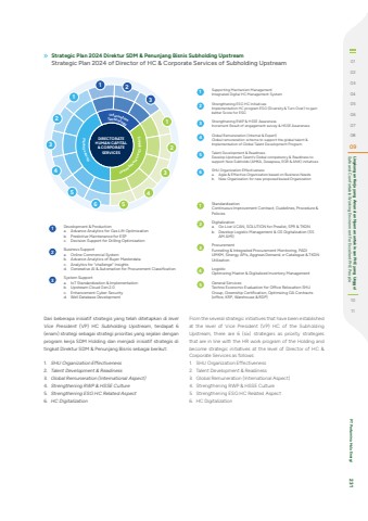 Dari beberapa inisiatif strategis yang telah ditetapkan di levelVice President (VP) HC Subholding Upstream, terdapat 6 (enam) strategi sebagai strategi prioritas yang sejalan dengan program kerja SDM Holding dan menjadi inisiatif strategis di tingkat Direktur SDM & Penunjang Bisnis sebagai berikut: 1. SHU Organization Effectiveness 2. Talent Development & Readiness 3. Global Remuneration (International Aspect) 4. Strengthening RWP & HSSE Culture 5. Strengthening ESG HC Related Aspect 6. HC Digitalization From the several strategic initiatives that have been established at the level of Vice President (VP) HC of the Subholding Upstream, there are 6 (six) strategies as priority strategies that are in line with the HR work program of the Holding and become strategic initiatives at the level of Director of HC & Corporate Services as follows:1. SHU Organization Effectiveness2. Talent Development & Readiness3. Global Remuneration (International Aspect)4. Strengthening RWP & HSSE Culture5. Strengthening ESG HC Related Aspect6. HC Digitalization1 StandardizationContinuous Improvement Contract, Guidelines, Procedure & Policies2 Digitalizationa. Go Live UCAN, SOLUTION for Prealist, SPR & TKDNb. Develop Logistic Management & GS Digitalization (SS AM AMI)3 ProcurementFunneling & Integrated Procurement Monitoring, PADI UMKM, Sinergy APIs, Aggreas Demand, e-Catalogue & TKDN Utilization4 LogisticOptimizing Master & Digitalized Inventory Management5 General ServicesTechno Economic Evaluation for Office Relocation SHU Group, Greenship Certification, Optimizing GA Contracts (office, KRP, Warehouse & RDP)1 Development & Productiona. Advance Analytics for Gas Lift Optimizationb. Predictive Maintenance for ESPc. Decision Support for Drilling Optimization2 Business Supporta. Online Commercial Systemb. Advance Analytics of Buyer Masterdatac. Analytics for %u201cchallenge%u201d Insightsd. Generative AI & Automation for Procurement Classification3 System Supporta. IoT Standardization & Implementationb. Upstream Cloud Gen 2.0c. Enhancement Cyber Securityd. Well Database Development11234512345623DIRECTORATE HUMAN CAPITAL & CORPORATE SERVICESHuman CapitalSupply Cha ni Managme en tTIencfhonrmoationlogy1 Supporting Mechanism ManagementIntegrated Digital HC Management System2 Strengthening ESG HC InitiativesImplementation HC program ESG (Diversity & Turn Over) to gain better Score for ESG3 Strengthening RWP & HSSE AwarenessIncrement Result of engagement survey & HSSE Awareness4 Global Remuneration (Internal & Expert)Global remuneration scheme to support the global talent & Implementation of Global Talent Development Program5 Talent Development & ReadinessDevelop Upstream Talent%u2019s Global competency & Readiness to support New Subholds (AMKA, Deeapsea, EOR & ANK) initiatives6 SHU Organization Effectivenessa. Agile & Effective Organization based on Business Needsb. New Organization for new proposed based OrganizationStrategic Plan 2024 Direktur SDM & Penunjang Bisnis Subholding Upstream Strategic Plan 2024 of Director of HC & Corporate Services of Subholding Upstream 010203040506070809 Safe and Comfortable Working Environment For Excellent PHE People Lingkungan Kerja yang Aman dan Nyaman untuk Insan PHE yang Unggul1011 PT Pertamina Hulu Energi 231