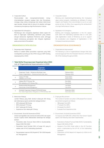 3. Corporate Culture Merencanakan dan mengimplementasikan menginternalisasikan program budaya tata nilai Perusahaan, menjaga sikap saling menghargai dan bebas diskriminasi agar berjalan dengan baik di seluruh lini jabatan sehingga mendukung tercapainya High Performance Culture.4. Digitalized HC & Analytics Membangun dan mengelola digitalisasi dalam aspek HC baik di lingkungan Subholding Upstream yang selaras dengan kebutuhan digitalisasi Pertamina wide, sehingga dapat mendukung percepatan dan integrasi digitalisasi pada proses bisnis Perusahaan. ORGANISASI & TATA KELOLA1. Penyempurnaan Organisasi Berikut ini adalah daftar perubahan organisasi yang telah mendapatkan persetujuan Dirut PHE maupun SDM Holding sepanjang tahun 2024. 3. Corporate CulturePlanning and implementing/internalizing the Company%u2019s value culture program, maintaining an attitude of mutual respect and freedom from discrimination so as to run well across all lines of office, thus supporting the achievement of a High Performance Culture.4. Digitalized HC & Analytics Building and managing digitalization in the HC aspect both within the Subholding Upstream that is in line with wide digitalization needs of Pertamina, so as to support the acceleration and integration of digitalization in the Company%u2019s business processes.ORGANIZATION & GOVERNANCE 1. Organizational ImprovementThe following is a list of organizational changes that have received approval from the President Directors of PHE and HR of the Holding throughout 2024. No Organisasi OrganizationTmt Efektif Effective Date1 Organisasi Projek %u2013 Pertamina Norhteast Java Project Organization %u2013 Pertamina North East JavaFebruari 2024 February 20242 Validasi PT PDSIValidation of PT PDSIMaret 2024 March 20243 Validasi PRL PT Elnusa, Tbk.PRL Validation of PT Elnusa, Tbk. Mei 2024 May 20244 Direktorat Risk ManagementDirectorate of Risk ManagemenJuli 2024 July 20245 Endstate Organisasi Integrasi PHR & WK RokanEnd-state Organization Integration of PHR & Rokan WADesember 2024 December 20242. Rekrutmen Pekerja Jumlah Pekerja yang telah direkrut sebanyak 330 Orang dari beberapa program perekrutan sebagai berikut: %u2022 BPS sebanyak 198 Orang, %u2022 BPA sebanyak 77 Orang, %u2022 BKJT sebanyak 50 Orang, %u2022 Experience Hire sebanyak 5 Orang. 3. Environment, Social & Governance (ESG) Untuk meningkatkan dan memenuhi kriteria ESG dari aspek Human Capital, terlah dilaksanakan beberapa hal sebagai berikut: %u2022 Penerbitan data Turnover Rate 2023 di Sustainability Report (SR) PHE 2023 %u2022 Penerbitan Surat Perintah ESG di Fungsi HC yang di sahkan oleh VP HC Subholding Upstream%u2022 Penyampaian Laporan ESG Aspek HC TW I 2024 kepada HC Management2. Employee RecruitmentThe number of workers recruited is 330 people from several recruitment programs as follows:%u2022 198 people from BPS,%u2022 77 people from BPA,%u2022 50 people from BKJT,%u2022 5 people from Experience Hire. 3. Environment, Social & Governance (ESG)To improve and fulfill ESG criteria from the Human Capital aspect, the following have been implemented:%u2022 Publication of data of Turnover Rate 2023 in Sustainability Report (SR) 2023 of PHE%u2022 Issuance of an ESG Order Letter in the HC Function which is authorized by the VP HC of the Subholding Upstream%u2022 Submission of ESG Report HC Aspects Q I 2024 to HC ManagementTabel Daftar Penyempurnaan Organisasi tahun 2024List of Organizational Improvements in 2024010203040506070809 Safe and Comfortable Working Environment For Excellent PHE People Lingkungan Kerja yang Aman dan Nyaman untuk Insan PHE yang Unggul1011 PT Pertamina Hulu Energi 233