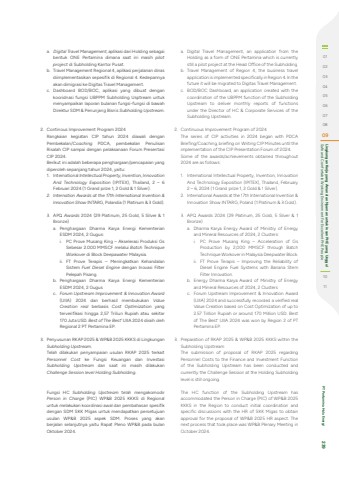 a. Digital Travel Management, aplikasi dari Holding sebagai bentuk ONE Pertamina dimana saat ini masih pilot project di Subholding Kantor Pusat. b. Travel Management Regional 4, aplikasi perjalanan dinas diimplementasikan sepesifik di Regional 4. Kedepannya akan dimigrasi ke Digitas Travel Management. c. Dashboard BOD/BOC, aplikasi yang dibuat dengan kooridnasi fungsi UBPPM Subholding Usptream untuk menyampaikan laporan bulanan fungsi-fungsi di bawah Direktur SDM & Penunjang Bisnis Subholding Upstream. 2. Continous Improvement Program 2024 Rangkaian kegiatan CIP tahun 2024 diawali dengan Pembekalan/Coaching PDCA, pembekalan Penulisan Risalah CIP sampai dengan pelaksanaan Forum Presentasi CIP 2024. Berikut ini adalah beberapa penghargaan/pencapaian yang diperoleh sepanjang tahun 2024, yaitu: 1. International Intellectual Property, Invention, Innovation And Technology Exposition (IPITEX), Thailand, 2 %u2013 6 Februari 2024 (1 Grand prize 1, 2 Gold & 1 Silver). 2. Internation Awards at the 17th International Invention & Innovation Show INTARG, Polandia (1 Platinum & 3 Gold).3. APQ Awards 2024 (29 Platinum, 25 Gold, 5 Silver & 1 Bronze) a. Penghargaan Dharma Karya Energi Kementerian ESDM 2024, 2 Gugus: i. PC Prove Musang King %u2013 Akselerasi Produksi Gs Sebesar 2.000 MMSCF melalui Batch Technique Workover di Block Deepawater Malaysia. ii. FT Prove Terapis %u2013 Meningkatkan Kehandalan Sistem Fuel Diesel Engine dengan Inovasi Filter Pelepah Pisang. b. Penghargaan Dharma Karya Energi Kementerian ESDM 2024, 2 Gugus c. Forum Upstream Improvement & Innovation Award(UIIA) 2024 dan berhasil membukukan Value Creation real berbasis Cost Optimization yang terverifikasi hingga 2,57 Triliun Rupiah atau sekitar 170 Juta USD. Best of The Best%u2019 UIIA 2024 diraih oleh Regional 2 PT Pertamina EP. 3. Penyusunan RKAP 2025 & WP&B 2025 KKKS di Lingkungan Subholding Upstream. Telah dilakukan penyampaian usulan RKAP 2025 terkait Personnel Cost ke Fungsi Keuangan dan Investasi Subholding Upstream dan saat ini masih dilakukan Challenge Session level Holding Subholding. Fungsi HC Subholding Upstream telah mengakomodir Person in Charge (PIC) WP&B 2025 KKKS di Regional untuk melakukan koordinasi awal dan pembahasan spesifik dengan SDM SKK Migas untuk mendapatkan persetujuan usulan WP&B 2025 aspek SDM. Proses yang akan berjalan selanjutnya yaitu Rapat Pleno WP&B pada bulan Oktober 2024. a. Digital Travel Management, an application from the Holding as a form of ONE Pertamina which is currently still a pilot project at the Head Office of the Subholding.b. Travel Management of Region 4, the business travel application is implemented specifically in Region 4. In the future it will be migrated to Digitas Travel Management.c. BOD/BOC Dashboard, an application created with the coordination of the UBPPM function of the Subholding Upstream to deliver monthly reports of functions under the Director of HC & Corporate Services of the Subholding Upstream. 2. Continuous Improvement Program of 2024The series of CIP activities in 2024 began with PDCA Briefing/Coaching, briefing on Writing CIP Minutes until the implementation of the CIP Presentation Forum of 2024.Some of the awards/achievements obtained throughout 2024 are as follows:1. International Intellectual Property, Invention, Innovation And Technology Exposition (IPITEX), Thailand, February 2 %u2013 6, 2024 (1 Grand prize 1, 2 Gold & 1 Silver).2. International Awards at the 17th International Invention & Innovation Show INTARG, Poland (1 Platinum & 3 Gold).3. APQ Awards 2024 (29 Platinum, 25 Gold, 5 Silver & 1 Bronze)a. Dharma Karya Energy Award of Ministry of Energy and Mineral Resources of 2024, 2 Clusters:i. PC Prove Musang King %u2013 Acceleration of Gs Production by 2,000 MMSCF through Batch Technique Workover in Malaysia Deepwater Block.ii. FT Prove Terapis %u2013 Improving the Reliability of Diesel Engine Fuel Systems with Banana Stem Filter Innovation.b. Energy Dharma Karya Award of Ministry of Energy and Mineral Resources of 2024, 2 Clustersc. Forum Upstream Improvement & Innovation Award (UIIA) 2024 and successfully recorded a verified real Value Creation based on Cost Optimization of up to 2.57 Trillion Rupiah or around 170 Million USD. Best of The Best%u2019 UIIA 2024 was won by Region 2 of PT Pertamina EP.3. Preparation of RKAP 2025 & WP&B 2025 KKKS within the Subholding Upstream The submission of proposal of RKAP 2025 regarding Personnel Costs to the Finance and Investment Function of the Subholding Upstream has been conducted and currently the Challenge Session at the Holding Subholding level is still ongoing.The HC function of the Subholding Upstream has accommodated the Person in Charge (PIC) of WP&B 2025 KKKS in the Region to conduct initial coordination and specific discussions with the HR of SKK Migas to obtain approval for the proposal of WP&B 2025 HR aspect. The next process that took place was WP&B Plenary Meeting in October 2024.010203040506070809 Safe and Comfortable Working Environment For Excellent PHE People Lingkungan Kerja yang Aman dan Nyaman untuk Insan PHE yang Unggul1011 PT Pertamina Hulu Energi 239