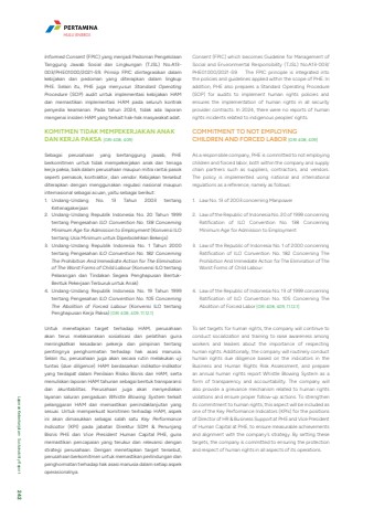 Informed Consent (FPIC) yang menjadi Pedoman Pengelolaan Tanggung Jawab Sosial dan Lingkungan (TJSL) No.A13-003/PHE01000/2021-S9. Prinsip FPIC diintegrasikan dalam kebijakan dan pedoman yang diterapkan dalam lingkup PHE. Selain itu, PHE juga menyusun Standard Operating Procedure (SOP) audit untuk implementasi kebijakan HAM dan memastikan implementasi HAM pada seluruh kontrak penyedia keamanan. Pada tahun 2024, tidak ada laporan mengenai insiden HAM yang terkait hak-hak masyarakat adat. KOMITMEN TIDAK MEMPEKERJAKAN ANAK DAN KERJA PAKSA [GRI 408, 409]Sebagai perusahaan yang bertanggung jawab, PHE berkomitmen untuk tidak mempekerjakan anak dan tenaga kerja paksa, baik dalam perusahaan maupun mitra rantai pasok seperti pemasok, kontraktor, dan vendor. Kebijakan tersebut diterapkan dengan menggunakan regulasi nasional maupun internasional sebagai acuan, yaitu sebagai berikut: 1. Undang-Undang No. 13 Tahun 2003 tentang Ketenagakerjaan2. Undang-Undang Republik Indonesia No. 20 Tahun 1999 tentang Pengesahan ILO Convention No. 138 Concerning Minimum Age for Admission to Employment (Konvensi ILO tentang Usia Minimum untuk Diperbolehkan Bekerja)3. Undang-Undang Republik Indonesia No. 1 Tahun 2000 tentang Pengesahan ILO Convention No. 182 Concerning The Prohibition And Immediate Action for The Elimination of The Worst Forms of Child Labour (Konvensi ILO tentang Pelarangan dan Tindakan Segera Penghapusan BentukBentuk Pekerjaan Terburuk untuk Anak)4. Undang-Undang Republik Indonesia No. 19 Tahun 1999 tentang Pengesahan ILO Convention No. 105 Concerning The Abolition of Forced Labour (Konvensi ILO tentang Penghapusan Kerja Paksa) [GRI 408, 409, 11.12.1]Untuk menetapkan target terhadap HAM, perusahaan akan terus melaksanakan sosialisasi dan pelatihan guna meningkatkan kesadaran pekerja dan pimpinan tentang pentingnya penghormatan terhadap hak asasi manusia. Selain itu, perusahaan juga akan secara rutin melakukan uji tuntas (due diligence) HAM berdasarkan indikator-indikator yang terdapat dalam Penilaian Risiko Bisnis dan HAM, serta menuliskan laporan HAM tahunan sebagai bentuk transparansi dan akuntabilitas. Perusahaan juga akan menyediakan layanan saluran pengaduan Whistle Blowing System terkait pelanggaran HAM dan memastikan penindaklanjutan yang sesuai. Untuk memperkuat komitmen terhadap HAM, aspek ini akan dimasukkan sebagai salah satu Key Performance Indicator (KPI) pada jabatan Direktur SDM & Penunjang Bisnis PHE dan Vice President Human Capital PHE, guna memastikan pencapaian yang terukur dan relevansi dengan strategi perusahaan. Dengan menetapkan target tersebut, perusahaan berkomitmen untuk memastikan perlindungan dan penghormatan terhadap hak asasi manusia dalam setiap aspek operasionalnya.Consent (FPIC) which becomes Guideline for Management of Social and Environmental Responsibility (TJSL) No.A13-003/PHE01000/2021-S9. The FPIC principle is integrated into the policies and guidelines applied within the scope of PHE. In addition, PHE also prepares a Standard Operating Procedure (SOP) for audits to implement human rights policies and ensures the implementation of human rights in all security provider contracts. In 2024, there were no reports of human rights incidents related to indigenous peoples%u2019 rights.COMMITMENT TO NOT EMPLOYING CHILDREN AND FORCED LABOR [GRI 408, 409]As a responsible company, PHE is committed to not employing children and forced labor, both within the company and supply chain partners such as suppliers, contractors, and vendors. The policy is implemented using national and international regulations as a reference, namely as follows:1. Law No. 13 of 2003 concerning Manpower2. Law of the Republic of Indonesia No. 20 of 1999 concerning Ratification of ILO Convention No. 138 Concerning Minimum Age for Admission to Employment3. Law of the Republic of Indonesia No. 1 of 2000 concerning Ratification of ILO Convention No. 182 Concerning The Prohibition And Immediate Action for The Elimination of The Worst Forms of Child Labour4. Law of the Republic of Indonesia No. 19 of 1999 concerning Ratification of ILO Convention No. 105 Concerning The Abolition of Forced Labor [GRI 408, 409, 11.12.1]To set targets for human rights, the company will continue to conduct socialization and training to raise awareness among workers and leaders about the importance of respecting human rights. Additionally, the company will routinely conduct human rights due diligence based on the indicators in the Business and Human Rights Risk Assessment, and prepare an annual human rights report Whistle Blowing System as a form of transparency and accountability. The company will also provide a grievance mechanism related to human rights violations and ensure proper follow-up actions. To strengthen its commitment to human rights, this aspect will be included as one of the Key Performance Indicators (KPIs) for the positions of Director of HR & Business Support at PHE and Vice President of Human Capital at PHE, to ensure measurable achievements and alignment with the company's strategy. By setting these targets, the company is committed to ensuring the protection and respect of human rights in all aspects of its operations.HULU ENERGILaporan Keberlanjutan %u2022 Sustainability Report 242