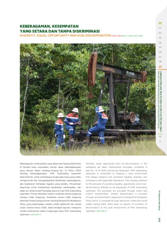 Keberagaman, kesempatan yang setara dan tanpa diskriminasi di tempat kerja merupakan prinsip dasar ketenagakerjaan yang dimuat dalam Undang-Undang No. 13 Tahun 2003 tentang Ketenagakerjaan. PHE Subholding Upstream berkomitmen untuk membangun lingkungan kerja yang selalu menghormati dan mengedepankan kesetaraan, keberagaman, dan kepatuhan terhadap regulasi yang berlaku. Perusahaan berprinsip untuk memberikan kesetaraan, kesempatan, dan sikap non-diskriminatif terhadap seluruh insan PHE Subholding Upstream. Prinsip diberikan melalui sosialisasi secara langsung maupun tidak langsung. Sosialisasi secara tidak langsung diberikan melalui pengumuman tentang Respectful Workplace Policy yang disampaikan melalui media elektronik dan media sosial. Selama tahun 2024, tidak terdapat laporan mengenai insiden diskriminasi dalam lingkungan kerja PHE Subholding Upstream. [GRI 406-1]Diversity, equal opportunity and non-discrimination in the workplace are basic employment principles contained in Law No. 13 of 2003 concerning Manpower. PHE Subholding Upstream is committed to building a work environment that always respects and prioritizes equality, diversity, and compliance with applicable regulations. The company adheres to the principle of providing equality, opportunity, and a nondiscriminatory attitude to all employees of PHE Subholding Upstream. The principles are provided through direct and indirect dissemination. Indirect dissemination is provided through announcements regarding the Respectful Workplace Policy which is conveyed through electronic media and social media. During 2024, there were no reports of incidents of discrimination in the work environment of PHE Subholding Upstream. [GRI 406-1]KEBERAGAMAN, KESEMPATAN YANG SETARA DAN TANPA DISKRIMINASIDIVERSITY, EQUAL OPPORTUNITY AND NON-DISCRIMINATION [OJK F.18] [GRI 3-3, 202, 405, 406]010203040506070809 Safe and Comfortable Working Environment For Excellent PHE People Lingkungan Kerja yang Aman dan Nyaman untuk Insan PHE yang Unggul1011 PT Pertamina Hulu Energi 243