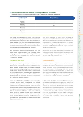Area OperasionalOperational Area Masyarakat LokalLocal CommunitiesRegional 1Region 1 18Regional 2Region 2 22Regional 3Region 3 2Regional 4Region 4 3Total 45Rekrutmen Masyarakat Lokal melalui BKJT (Bimbingan Keahlian Juru Teknik)Local Community Recruitment through BKJT (Technician Expertise Guidance)Dari 14.008 orang karyawan PHE tahun 2024, 45 orang merupakan karyawan yang direkrut dari masyarakat lokal melalui Program Bimbingan Keahlian Juru Teknik BKJT). Sementara itu, seluruh karyawan PHE (100%) berkewarganegaraan Indonesia. Perusahaan mendefinisikan karyawan lokal sebagai karyawan yang berkewarganegaraan sesuai dengan domisili Perusahaan, yaitu karyawan yang berkewarganegaraan Indonesia. PHE memberikan kesempatan pengembangan karir yang setara kepada seluruh karyawan untuk mencapai jenjang karir yang terbaik. Selama tahun 2024 terdapat 1.086 orang karyawan yang dapat menduduki posisi manajer ke atas, atau 7,67% dari total karyawan. TINGKAT TURNOVERDi samping bertambahnya jumlah pekerja melalui rekrutmen, Perseroan juga mengalami berkurangnya jumlah tenaga kerja akibat terdapat karyawan yang meninggalkan Perseroan dengan alasannya masing-masing. Perseroan memenuhi hak mereka sesuai regulasi yang diatur dalam Undang-Undang No.13 Tahun 2003 tentang Ketenagakerjaan, yang diperbarui melalui Undang-Undang Nomor 6 Tahun 2023 tentang Penetapan Peraturan Pemerintah Pengganti Undang-Undang No. 2 Tahun 2022 tentang Cipta Kerja.Selama tahun 2024, sebanyak 1,80% karyawan meninggalkan Perseroan dengan alasan mengundurkan diri, pensiun sukarela, dan lainnya. Jumlah tersebut menurun sebanyak 2.32%. Kondisi tersebut menggambarkan bahwa Perusahaan memiliki program-program retensi yang dapat menjaga serta meningkatkan loyalitas karyawan. Perhitungan tingkat turnoverdilakukan tanpa memperhitungkan jumlah Pensiun Sukarela karena komponen tersebut dianggap kurang tepat untuk menentukan tingkat turnover pekerja. Hal ini selaras dengan Survei Kepuasan Pekerja (Employee Satisfaction Survey) Tahun Buku 2024 yang mencapai 4.41 (skala 5) dari 4.31 (skala 5) pada tahun sebelumnya.From 14,008 employees of PHE in 2024, 45 people are employees recruited from the local community through the BKJT (Technician Expertise Guidance Program). Meanwhile, all employees of PHE (100%) are Indonesian citizens. The company defines local employees as employees whose citizenship is in accordance with the Company%u2019s domicile, namely employees who are Indonesian citizens.PHE provides equal career development opportunities to all employees to achieve the best career level. During 2024, there were 1,086 employees who occupied managerial positions and above, or 7.67% of the total employees. TURNOVER RATEIn addition to increasing the number of workers through recruitment, the Company also experienced a reduction in the number of workers due to employees leaving the Company for their own reasons. The Company fulfills their rights in accordance with the regulations stipulated in Law No. 13 of 2003 concerning Manpower, which was updated through Law No. 6 of 2023 concerning Stipulation of Government Regulation in Lieu of Law No. 2 of 2022 concerning Job Creation.In 2024, a total of 1.80% of employees left the Company due to resignation, voluntary retirement, and other reasons. This figure represents a decrease of 2.32%, indicating that the Company has implemented effective retention programs that help maintain and enhance employee loyalty. The turnover rate calculation excludes Voluntary Retirement, as this component is considered less appropriate in assessing employee turnover levels. This condition aligns with the results of the 2024 Employee Satisfaction Survey, which recorded a score of 4.41 (on a scale of 5), an increase from 4.31 (on a scale of 5) in the previous year.010203040506070809 Safe and Comfortable Working Environment For Excellent PHE People Lingkungan Kerja yang Aman dan Nyaman untuk Insan PHE yang Unggul1011 PT Pertamina Hulu Energi 247