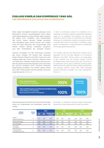 Dalam rangka meningkatkan kompetensi pekerjanya secara berkelanjutan, Perseroan menyelenggarakan sistem evaluasi kinerja bagi karyawannya. Evaluasi tersebut dapat membantu tiap pekerja untuk mengetahui ruang pengembangan bagi individu maupun kelompok. Sebagai perusahaan yang bertanggung jawab, evaluasi tersebut harus berjalan secara adil tanpa diskriminasi atau menguntungkan pihak tertentu. Penilaian dilakukan berdasarkan pengukuran yang telah terstandardisasi dan disepakati bersama.Perseroan menetapkan KPI (Key Performance Indicator) bagi seluruh karyawan. KPI tersebut telah disesuaikan dengan Pertamina Reference Level (PRL), fungsi, divisi, serta tanggung jawab tiap individu. Kemudian, Perseroan secara rutin setiap tahun melakukan People Review Annual Process. Hasil dari penilaian tersbut akan digunakan untuk menentukan jalur promosi, penetapan bonus, penentuan kebutuhan, pengembangan kompetensi, dan portfolio pekerja. Selama tahun 2024, 100% karyawan menerima penilaian kinerja dan pengembangan karir. [GRI 404-3]In order to continuously improve the competence of its employees, the Company organizes a performance evaluation system for its employees. The evaluation can help each employee to know the areas of improvement for individuals and groups. As a responsible company, the evaluation must be conducted fairly without discrimination or benefiting certain parties. The assessment is conducted based on standardized and mutually agreed measurements.The Company sets KPI (Key Performance Indicator) for all employees. The KPI has been adjusted to the Pertamina Reference Level (PRL), function, division, and responsibility of each individual. Then, the Company routinely conducts the People Review Annual Process every year. The results of the assessment will be used to determine promotion paths, determine bonuses, determine needs, develop competencies, and employee portfolios. During 2024, 100% Employees received performance evaluation and career development. [GRI 404-3]EVALUASI KINERJA DAN KOMPENSASI YANG ADILFAIR PERFORMANCE EVALUATION AND COMPENSATIONPersentase Karyawan yang Menerima Tinjauan Rutin Terhadap Kinerja dan Pengembangan Karir Berdasarkan Gender dan Jabatan.Percentage of Employees Receiving Regular Performance Reviews and Career Development by Gender and PositionJabatanPositionSatuanUnits2024 2023 2022KeseluruhanOverallKeseluruhanOverallKeseluruhanOverallDireksiBoard of Directors % 100 100 100 100 100 100 100 100 100General Manager % 100 100 100 100 100 100 100 100 100Vice President % 100 100 100 100 100 100 100 100 100KonsultanConsultant % 100 100 100 100 100 100 100 100 100Manajer/SetaraManager/Equivalent % 100 100 100 100 100 100 100 100 100Total Jumlah KaryawanTotal Number of EmployeesPersentasePercentageTotal Jumlah Karyawan yang Menerima Penilaian KinerjaTotal Number of Employees Receiving Performance Evaluations100%100% 100%010203040506070809 Safe and Comfortable Working Environment For Excellent PHE People Lingkungan Kerja yang Aman dan Nyaman untuk Insan PHE yang Unggul1011 PT Pertamina Hulu Energi 249