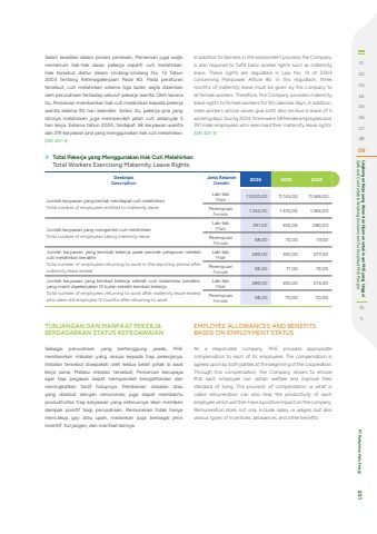 Selain keadilan dalam proses penilaian, Perseroan juga wajib memenuhi hak-hak dasar pekerja seperti cuti melahirkan. Hak tersebut diatur dalam Undang-Undang No. 13 Tahun 2003 tentang Ketenagakerjaan Pasal 82. Pada peraturan tersebut, cuti melahirkan selama tiga bulan wajib diberikan oleh perusahaan terhadap seluruh pekerja wanita. Oleh karena itu, Perseroan memberikan hak cuti melahirkan kepada pekerja wanita selama 90 hari kalender. Selain itu, pekerja pria yang istrinya melahirkan juga memperoleh jatah cuti sebanyak 5 hari kerja. Selama tahun 2024, terdapat 58 karyawan wanita dan 291 karyawan pria yang menggunakan hak cuti melahirkan. [GRI 401-3]In addition to fairness in the assessment process, the Company is also required to fulfill basic worker rights such as maternity leave. These rights are regulated in Law No. 13 of 2003 concerning Manpower Article 82. In this regulation, three months of maternity leave must be given by the company to all female workers. Therefore, the Company provides maternity leave rights to female workers for 90 calendar days. In addition, male workers whose wives give birth also receive a leave of 5 working days. During 2024, there were 58 female employees and 291 male employees who exercised their maternity leave rights.[GRI 401-3]DeskripsiDescriptionJenis KelaminGender 2024 2023 2022Jumlah karyawan yang berhak mendapat cuti melahirkanTotal number of employees entitled to maternity leaveLaki-lakiMale 11.000,00 11.143,00 11.346,00PerempuanFemale 1.342,00 1.370,00 1.365,00Jumlah karyawan yang mengambil cuti melahirkanTotal number of employees taking maternity leaveLaki-lakiMale 291,00 354,00 280,00PerempuanFemale 58,00 72,00 73,00Jumlah karyawan yang kembali bekerja pada periode pelaporan setelah cuti melahirkan berakhirTotal number of employees returning to work in the reporting period after maternity leave endedLaki-lakiMale 289,00 352,00 277,00PerempuanFemale 58,00 71,00 72,00Jumlah karyawan yang kembali bekerja setelah cuti melahirkan berakhir, yang masih dipekerjakan 12 bulan setelah kembali bekerjaTotal number of employees returning to work after maternity leave ended, who were still employed 12 months after returning to workLaki-lakiMale 289,00 350,00 274,00PerempuanFemale 58,00 70,00 70,00Total Pekerja yang Menggunakan Hak Cuti MelahirkanTotal Workers Exercising Maternity Leave RightsTUNJANGAN DAN MANFAAT PEKERJA BERDASARKAN STATUS KEPEGAWAIANSebagai perusahaan yang bertanggung jawab, PHE memberikan imbalan yang sesuai kepada tiap pekerjanya. Imbalan tersebut disepakati oleh kedua belah pihak di awal kerja sama. Melalui imbalan tersebut, Perseroan berupaya agar tiap pegawai dapat memperoleh kesejahteraan dan meningkatkan taraf hidupnya. Pemberian imbalan atau yang disebut dengan remunerasi juga dapat membantu produktivitas tiap karyawan yang seterusnya akan memberi dampak positif bagi perusahaan. Remunerasi tidak hanya mencakup gaji atau upah, melainkan juga berbagai jenis insentif, tunjangan, dan manfaat lainnya. EMPLOYEE ALLOWANCES AND BENEFITS BASED ON EMPLOYMENT STATUSAs a responsible company, PHE provides appropriate compensation to each of its employees. The compensation is agreed upon by both parties at the beginning of the cooperation. Through this compensation, the Company strives to ensure that each employee can obtain welfare and improve their standard of living. The provision of compensation or what is called remuneration can also help the productivity of each employee which will then have a positive impact on the company. Remuneration does not only include salary or wages, but also various types of incentives, allowances, and other benefits.010203040506070809 Safe and Comfortable Working Environment For Excellent PHE People Lingkungan Kerja yang Aman dan Nyaman untuk Insan PHE yang Unggul1011 PT Pertamina Hulu Energi 251